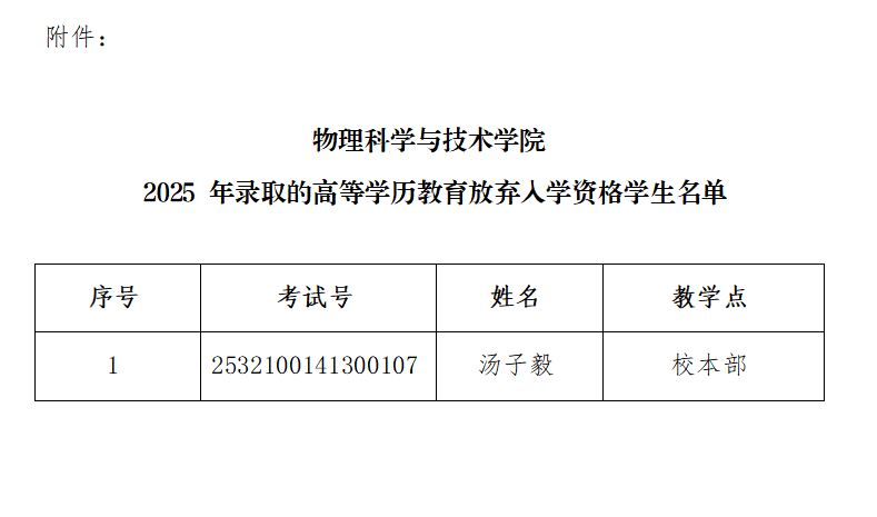 附件:物理科学与技术学院 2025 年录取的高等学历教育放弃入学资格学生名单