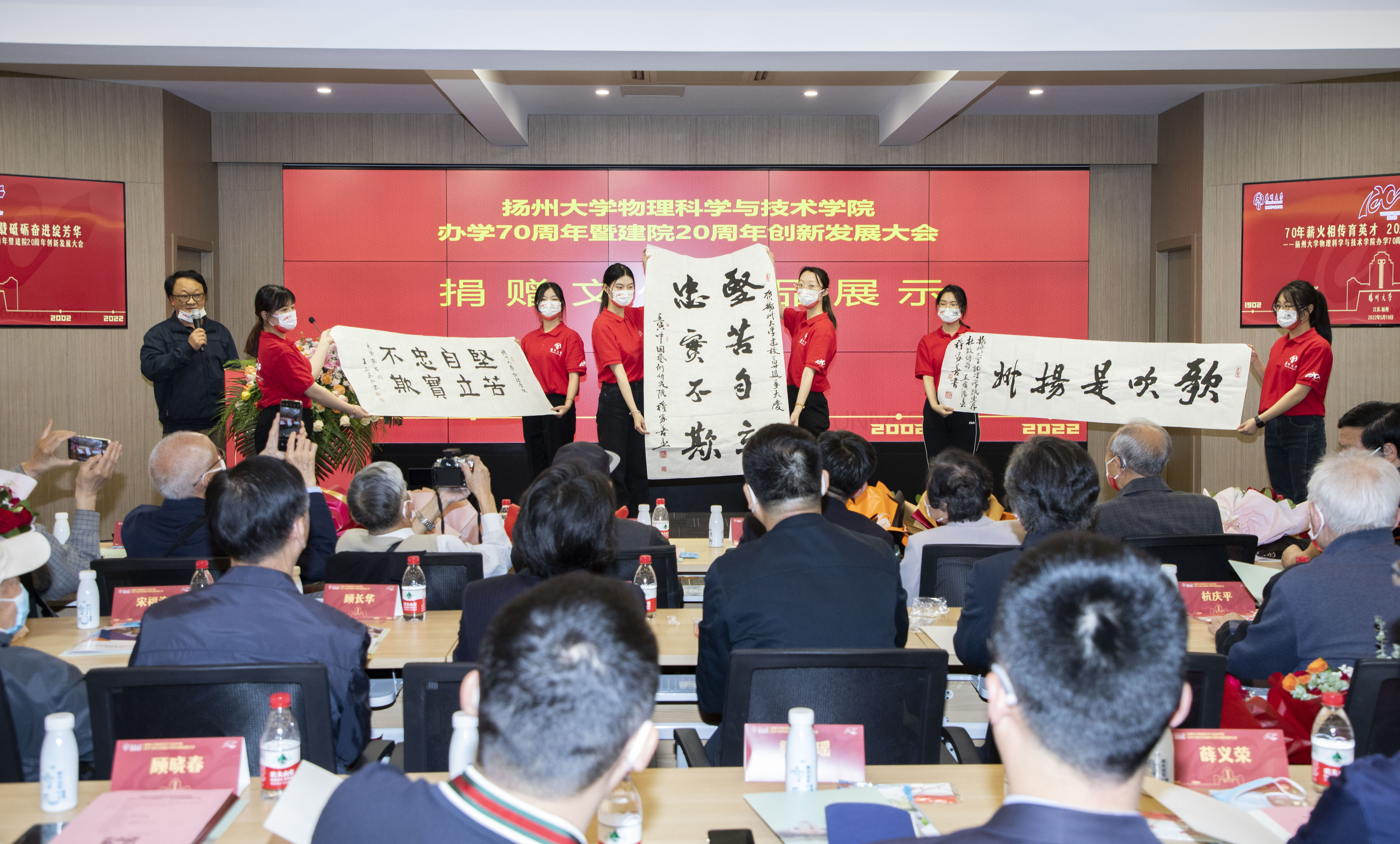 在“合作共建 爱心捐赠”环节,洪校长向扬州扬杰电子科技股份有限公司等单位和个人颁发捐赠证书上。扬杰党委书记、副董事长梁瑶先生代表合作单位发言,1987届校友丁铭捐赠并解读捐赠的“校训”等书法作品。