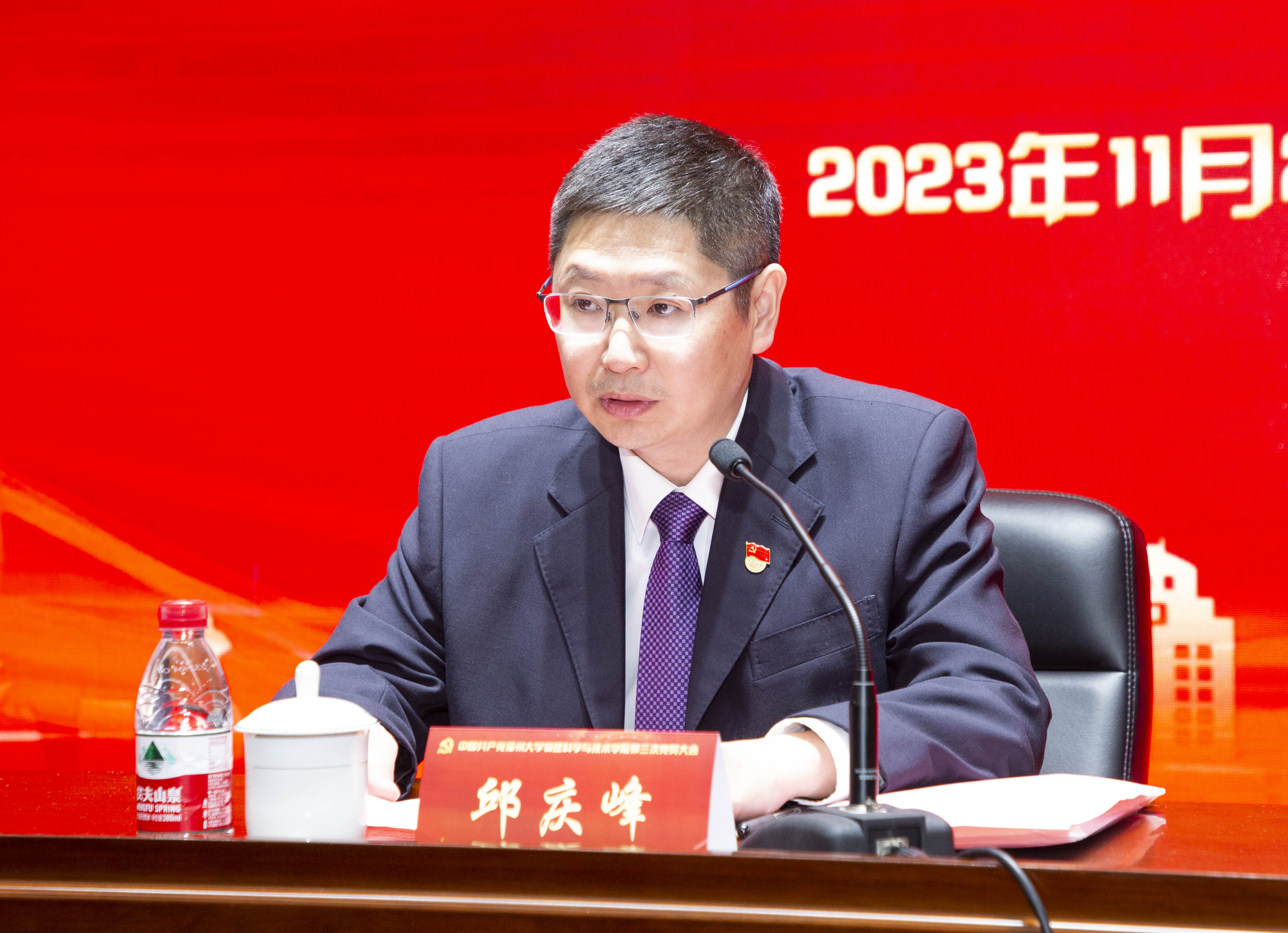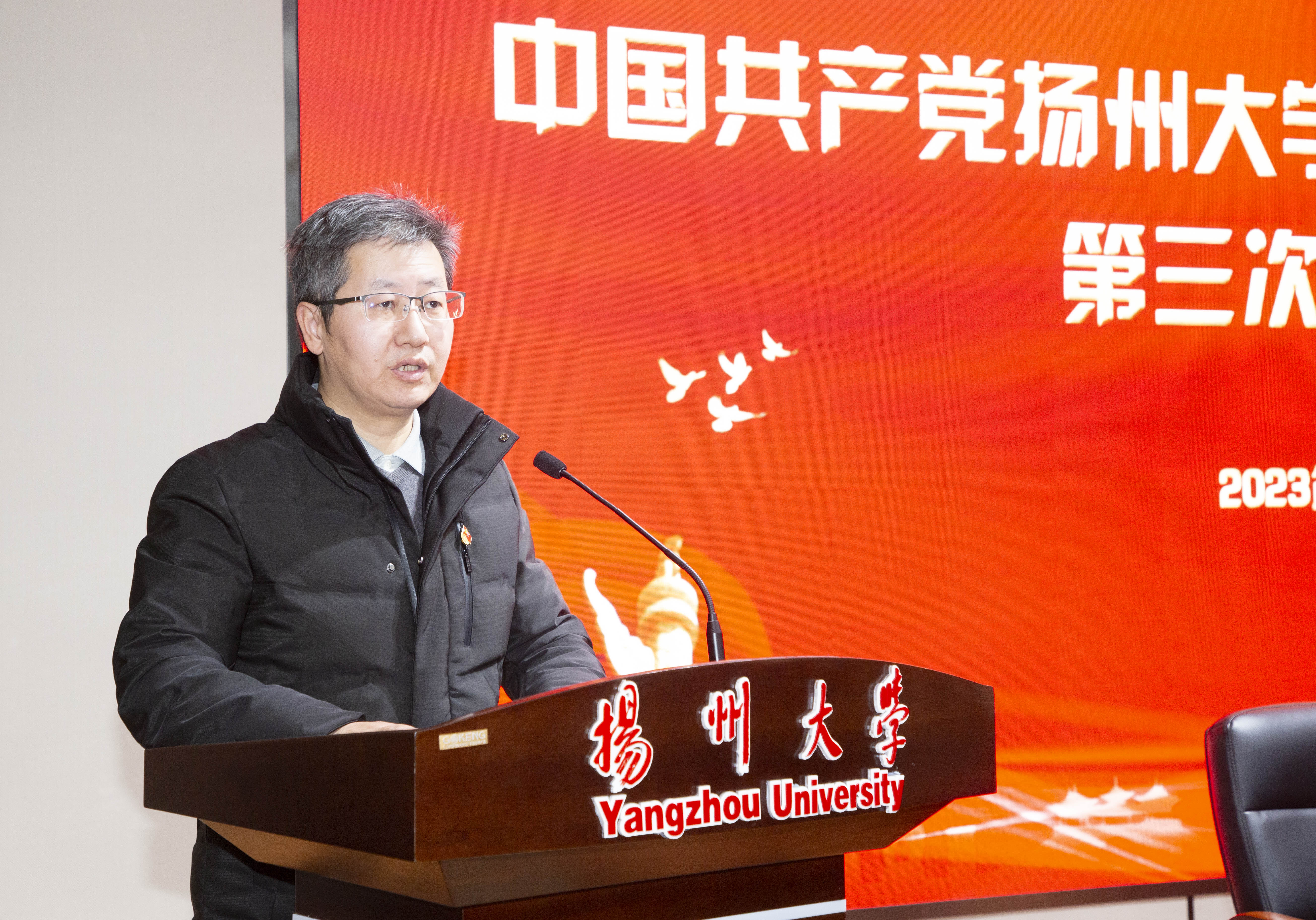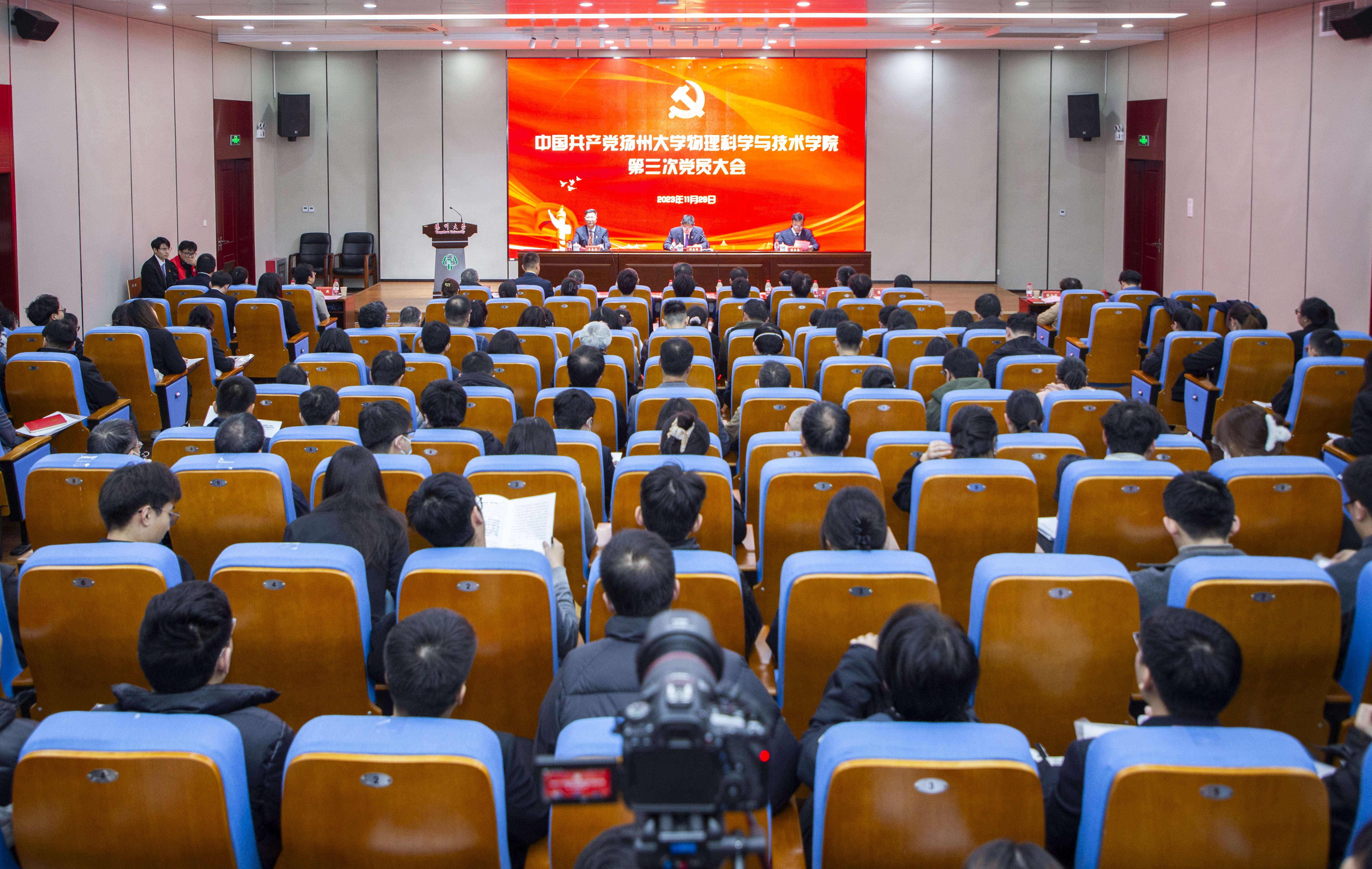 11月29日下午,中国共产党扬州大学物理科学与技术学院第三次党员大会在瘦西湖校区8号楼S405报告厅召开。校党委常委、纪委书记、江苏省监委派驻监察专员邱庆峰同志出席大会并讲话。校党校、组织部负责同志、物理学院师生党员、民主党派、无党派人士代表等200余人参加大会。
