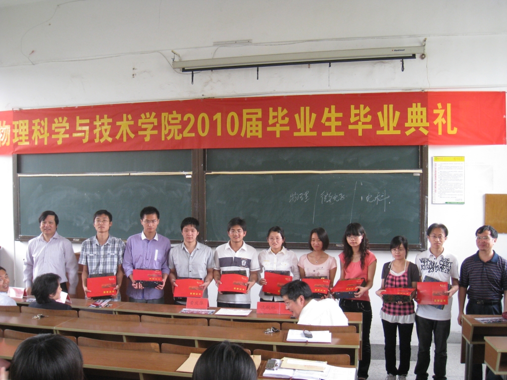 6月8日上午10:00,我院在瘦西湖校区西附二楼隆重举行2010届毕业生毕业典礼。全体院领导、教研中心主任、毕业班班主任出席了毕业典礼。庄严的国歌声中,院党委副书记沈秋林宣布典礼正式开始。在毕业班学生代表、教师代表相继发言后,院长陈小兵教授致辞。他指出,四年来,全体2010届毕业生努力学习,刻苦钻研,在各方面都取得了明显的进步,圆满完成了学业。其中,有百余人获得国家、省、校、院级各类荣誉称号和表彰,35人考取硕士研究生,2人考取村官,54人光荣地加入了中国共产党。希望大家在以后的生活中,爱岗敬业,踏实工作;勤于实践,勇于创新;直面艰难,勇于挑战。随后,王春雨副院长宣读了优秀毕业生名单,黄庆华书记和封国林教授为全体优秀毕业生颁发证书和奖品。