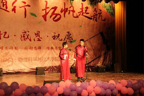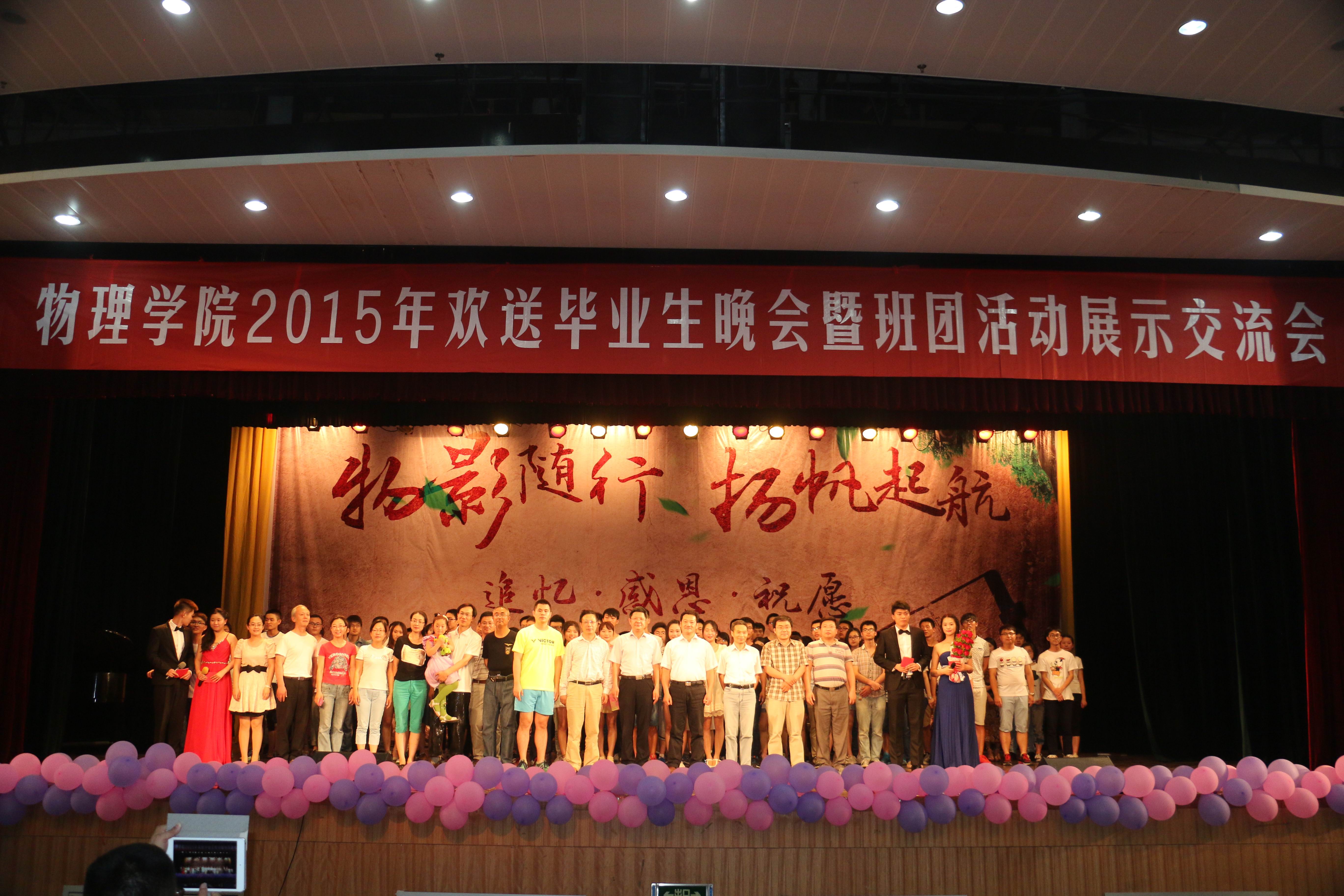 6月12日晚,我院以“物影随行,扬帆起航”为主题举行2015届毕业生晚会。晚会分为三个篇章:昔·追忆、惜·感恩、希·祝愿。晚会将浓浓同学情、师生情、母校情融入每个人的心中,让毕业生们充分感受到了物理学院大家庭的温暖。