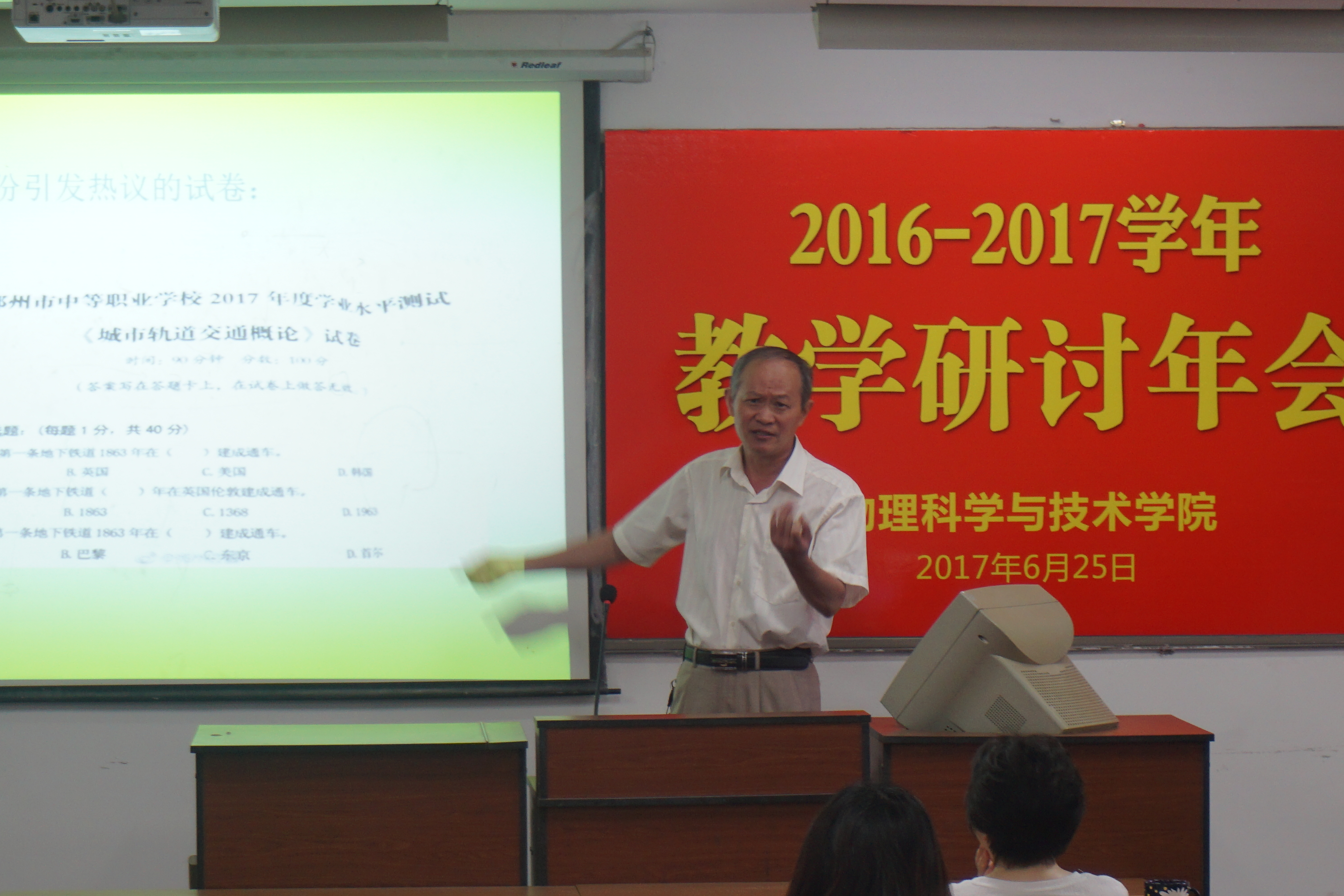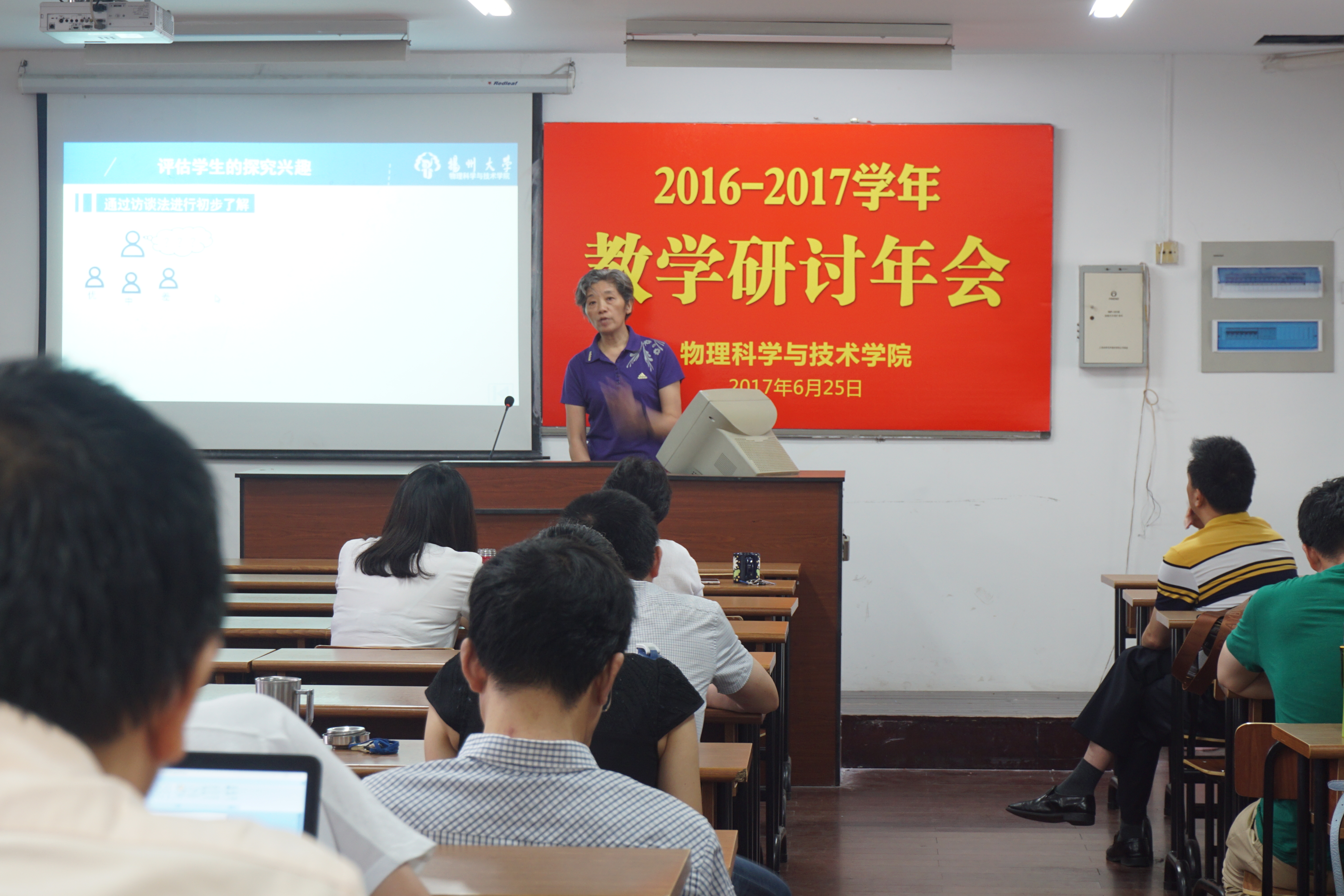 6月25日上午,我院在物理楼219举行2016-2017学年教学研讨年会,全体在扬院领导、教职工参加了年会。年会由我院院长曾祥华教授主持,2位校级教学督导、11位专任教师在会上做了专题报告。报告围绕试卷评阅、论文毕业设计评价、探究性课题学习实践、翻转课堂、微课设计、教学课程改革、研究性教学、全英文教学等多个专题展开,特色鲜明、针对性强。