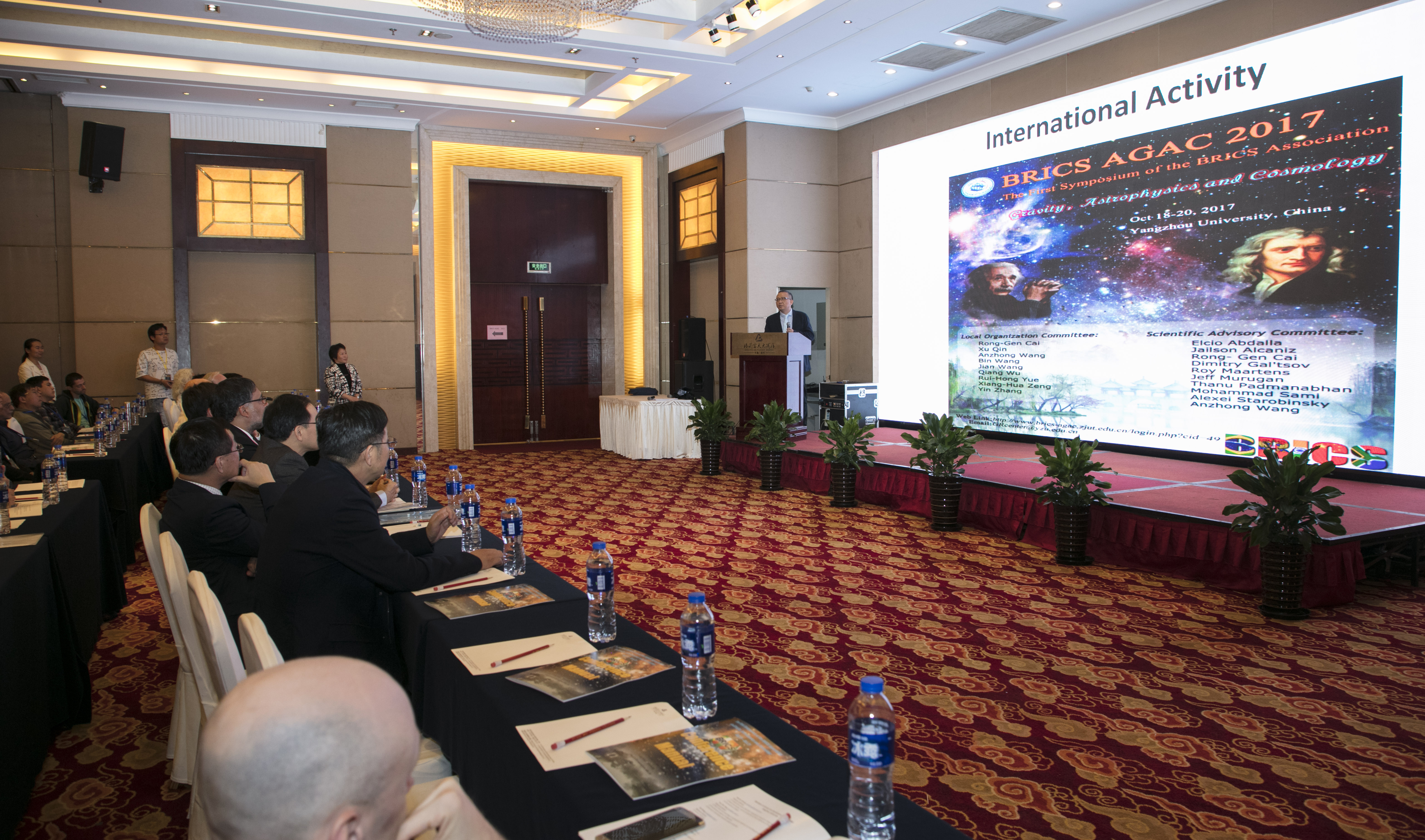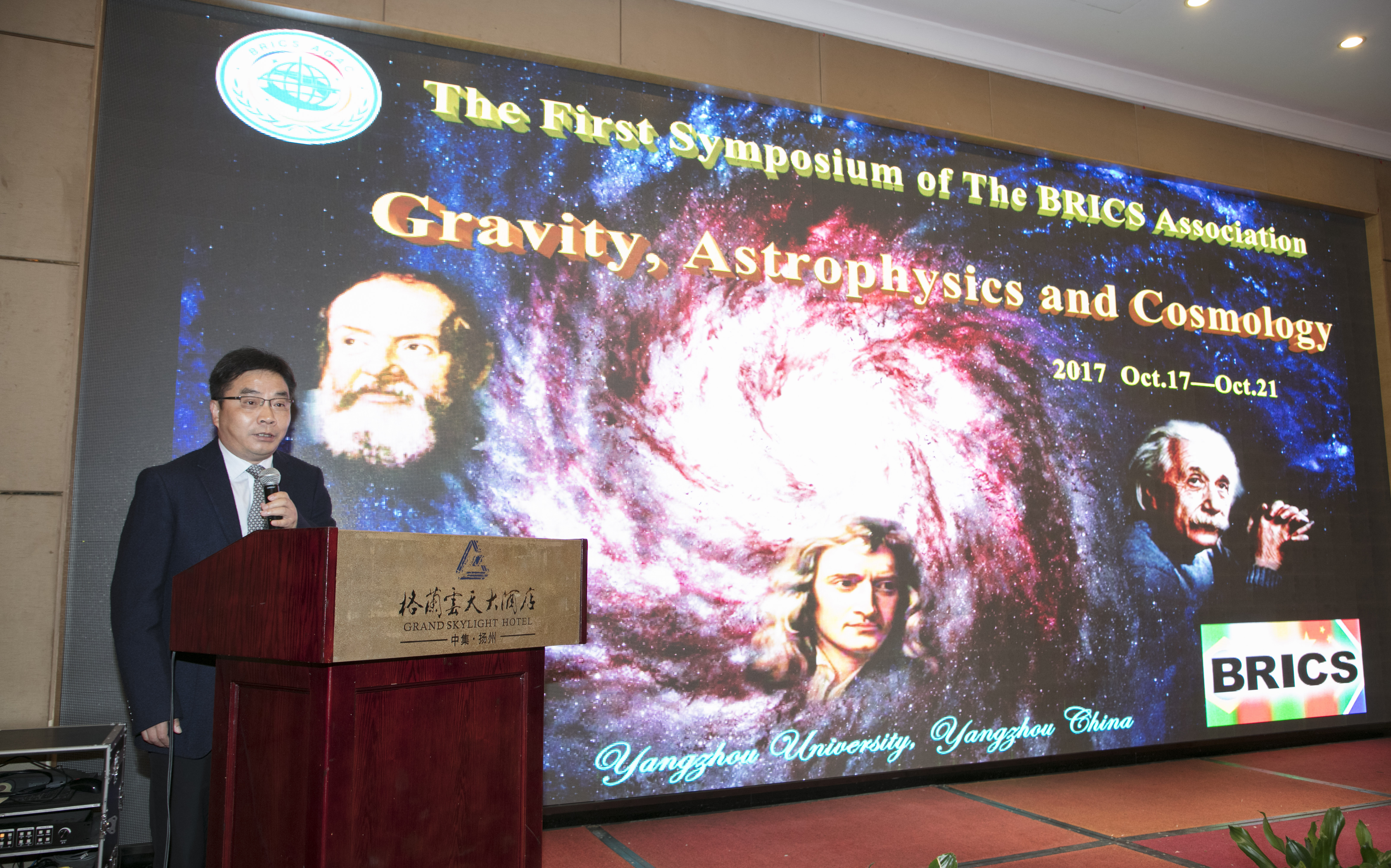 BRICS第一届引力、天文学与宇宙学国际研讨会在我校召开 由扬州大学主办、物理科学与技术学院协办的“BRICS第一届引力、天文学与宇宙学国际研讨会”于10月18日至20日在扬州隆重举行。会议由物理科学与技术学院院长曾祥华主持,校党委常委、副校长黄建晔在开幕式上致辞。校党委书记姚冠新、校长焦新安、副校长陈国宏在会议期间先后会见了巴西、哈萨克斯坦等国的外籍专家。
