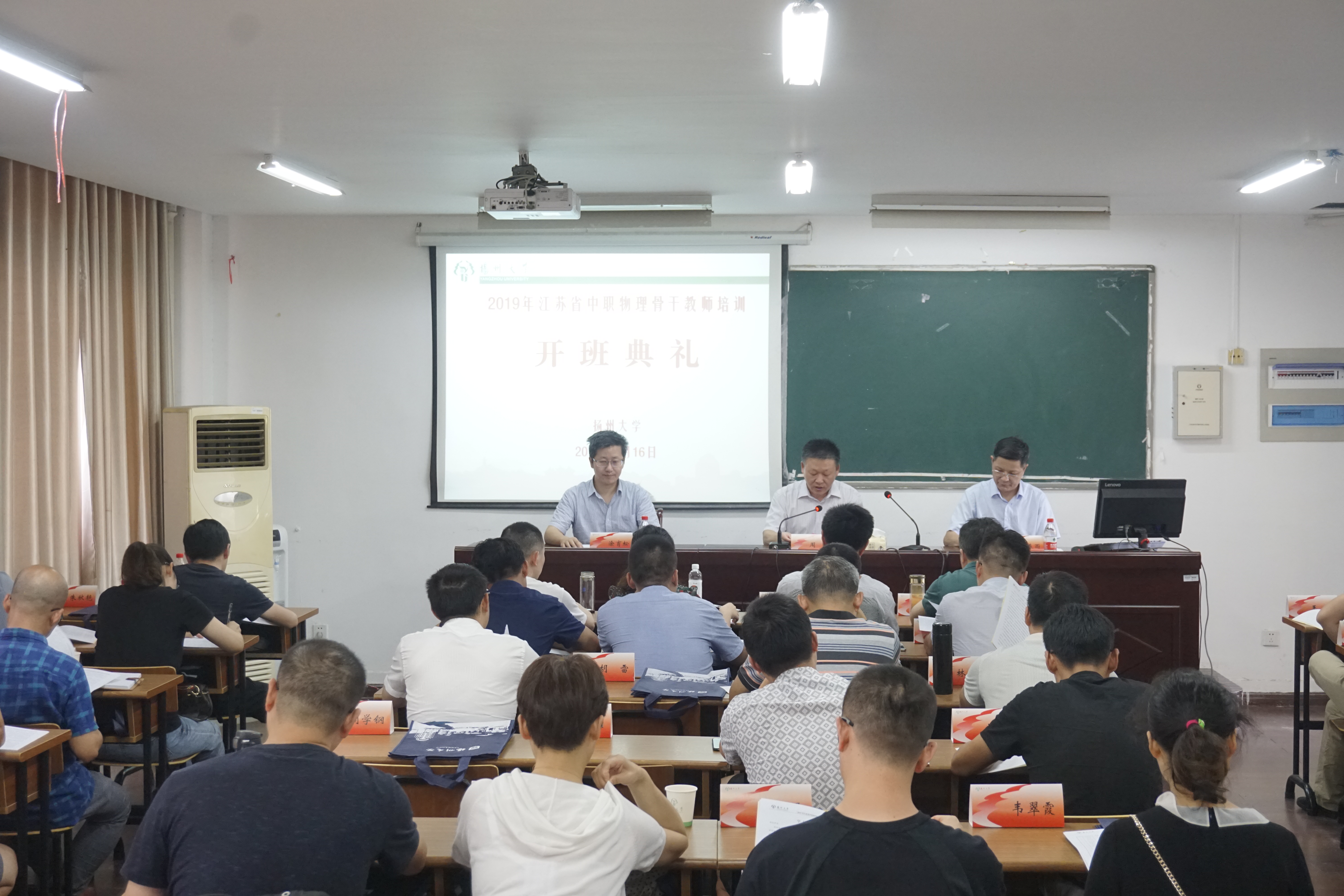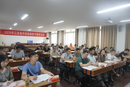 7月16日下午,2019年江苏省中职物理课骨干教师教育教学能力提升培训班开班仪式在扬州大学举行。扬州大学继续教育学院院长周斌、培训科科长张绍卓,物理科学与技术学院党委书记王春雨、副院长涂育松,以及来自全省中等职业学校的35名专业骨干教师参加了此次开班式。会议由王春雨书记主持。