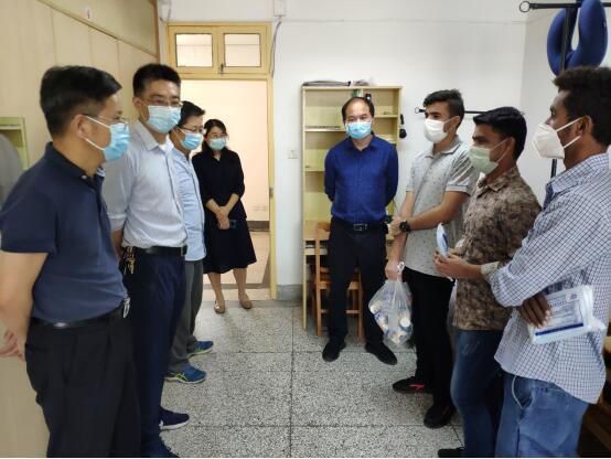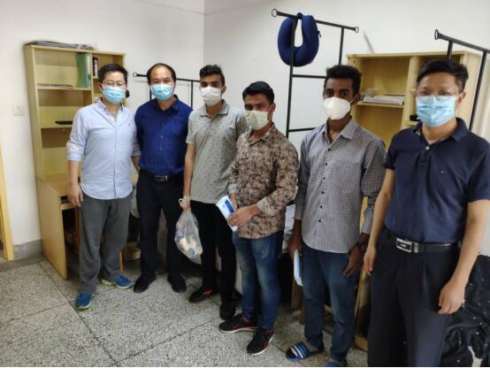5月26日,物理科学与技术学院党委书记王春雨、院长涂育松等来到文汇路校区55号楼亲切看望慰问2018级和2019级留校的微电专业留学生,给他们送去了酸奶和口罩等物品,并详细了解他们在疫情期间的生活和学习情况,留学生班主任们陪同看望。