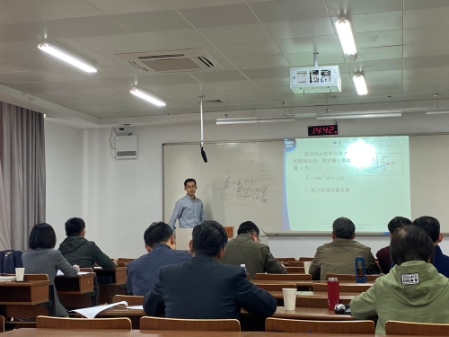 本次活动我院赵亮老师进行了汇报,赵老师以《角动量和角动量守恒定律》为内容,具体的讲述了角动量概念、定义式,角动量定律,再到角动量守恒定律等知识点。汇报过程中,赵亮老师语言响亮,教态自然,能够抛出问题引出内容,同时穿插例题解析,让学生更直观的了解授课内容。现场专家对新任青年教师的表现给与了肯定与好评,同时也从教学内容的设计、教态、板书、教学手段的多样化、教学环节设计等方面提出了建议与希望。
