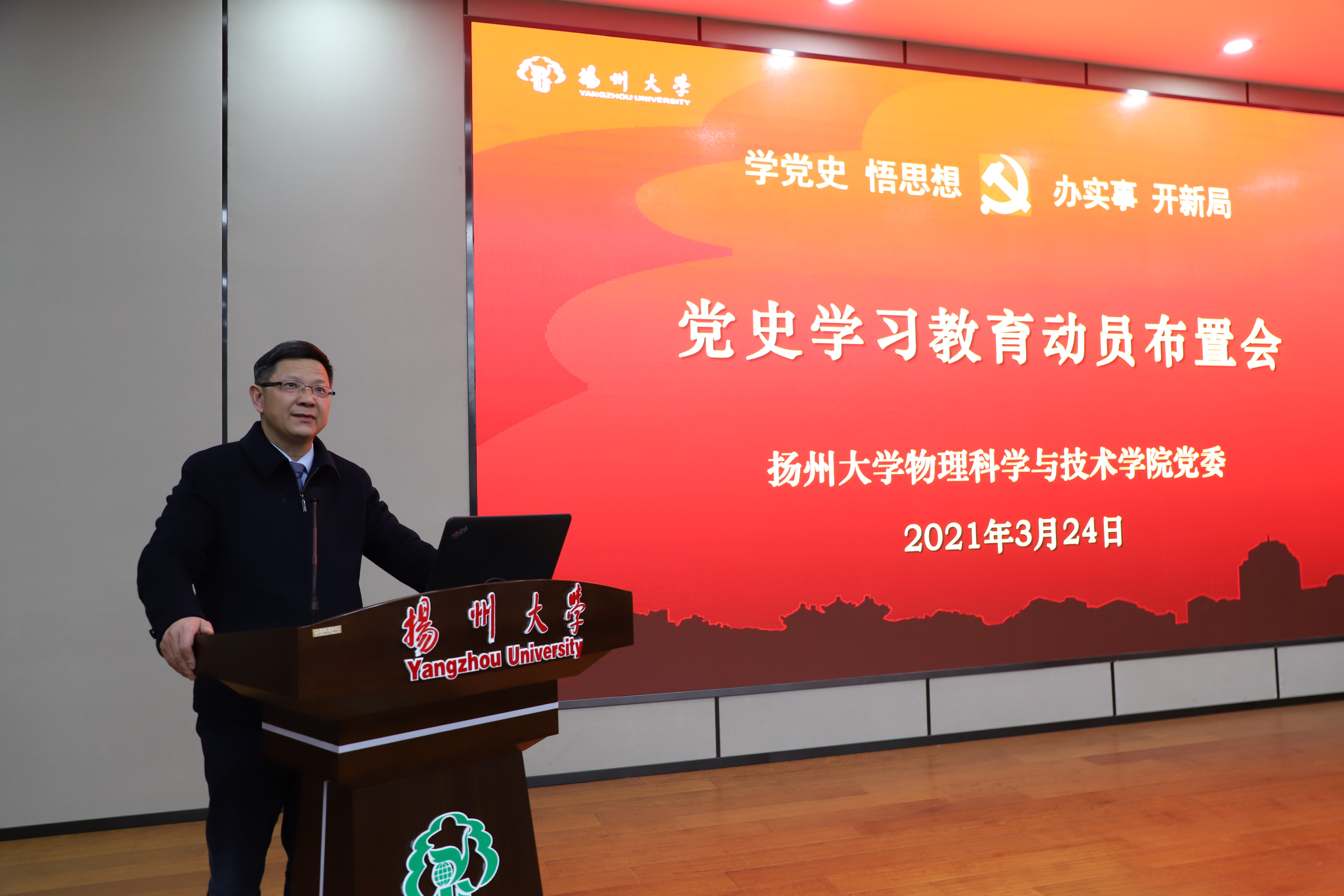 3月24日下午,学院党委在瘦西湖校区8号楼S405报告厅召开党史学习教育动员大会,党委书记王春雨主持会议并讲话,党委副书记、纪检委员高红明作部署动员,全体教职工党员、学生党支部书记参加会议。