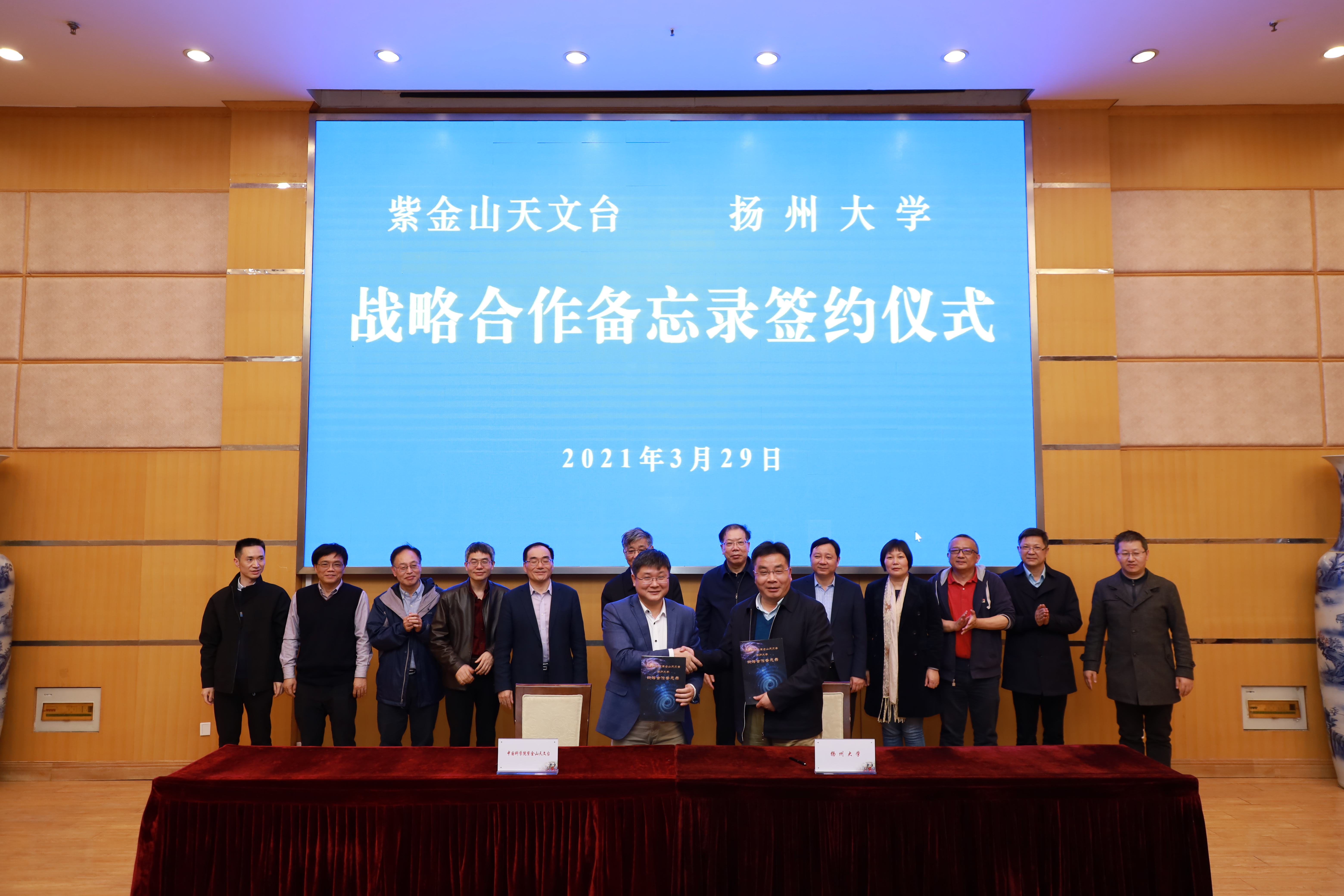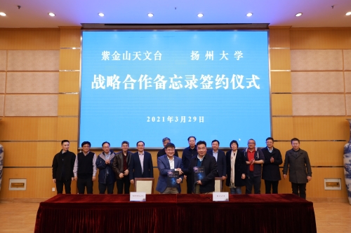 3月29日下午,扬州大学与中国科学院紫金山天文台战略合作备忘录签约仪式在荷花池校区多功能厅举行。学校党委书记姚冠新,江苏省科协副主席、南京大学教授祝世宁院士,中国科学院理论物理研究所所长蔡荣根院士在签约仪式上分别致辞,副校长黄建晔与中国科学院南京紫金山天文台副台长吴雪峰在双方战略合作备忘录上签字。