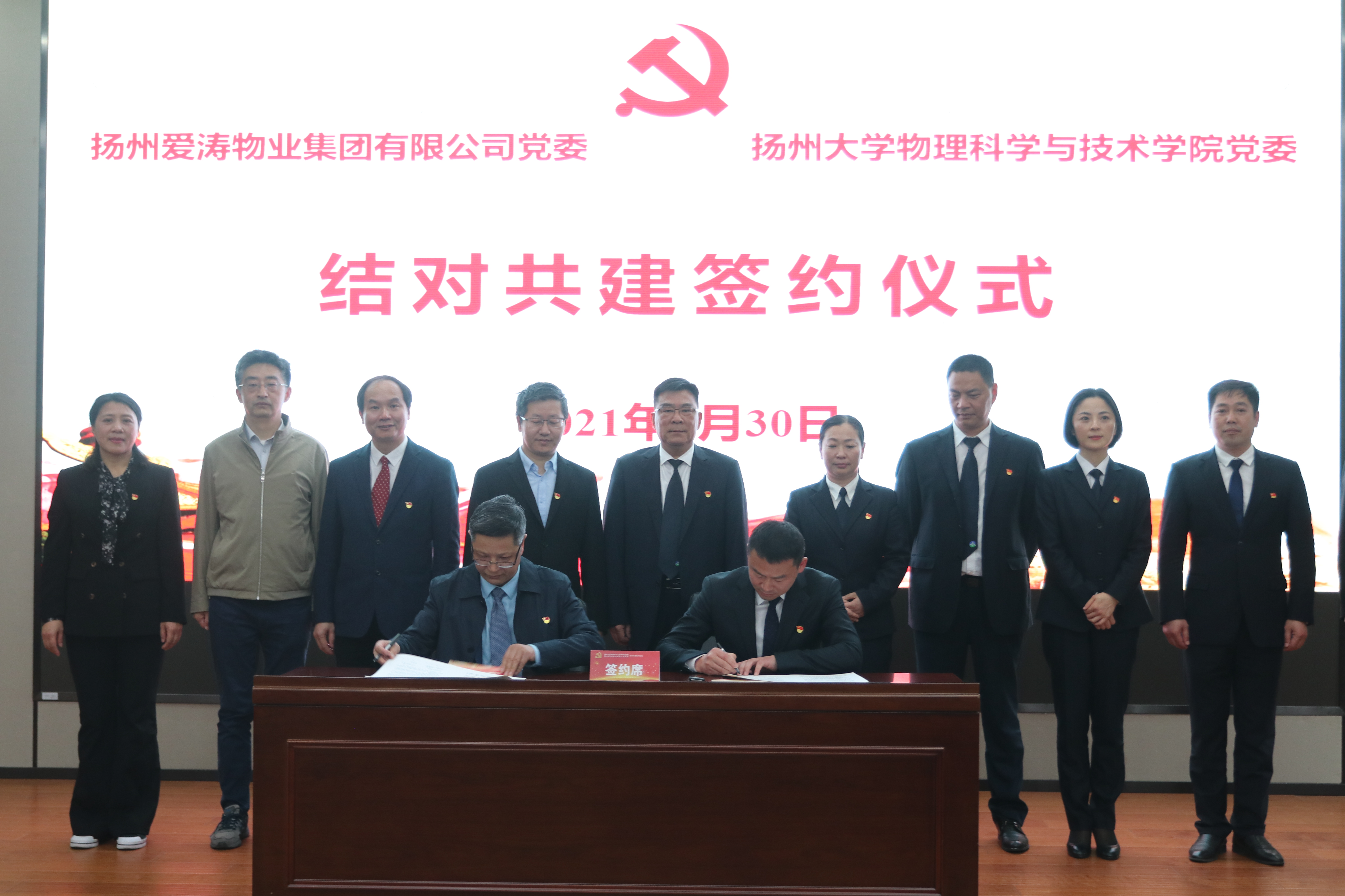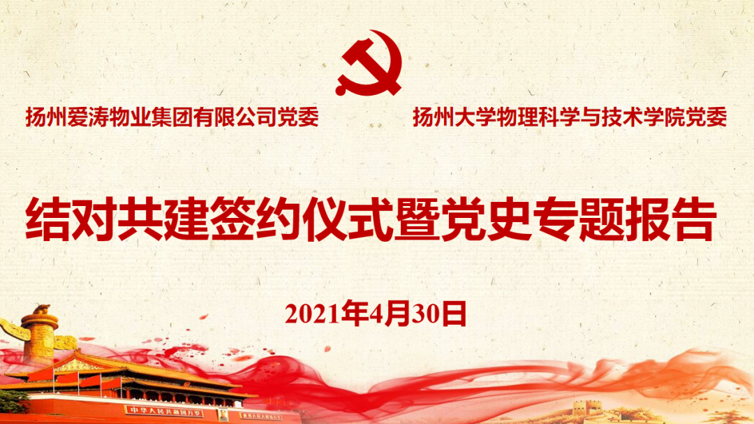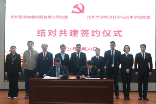 学院党委与扬州爱涛物业集团有限公司党委举行结对共建签约仪式暨党史学习教育专题报告会4月30日下午,学院党委与扬州爱涛物业集团有限公司党委结对共建签约仪式暨党史专题报告在瘦西湖校区8号楼S405报告厅举行。学院党委书记王春雨、院长涂育松、党委副书记高红明、副院长王伟、副院长于凤云,爱涛集团党委书记/董事长岳峻、党委副书记辛开平、副总赵群、黄加宏、财务总监李娟、党委委员、总助潘琪、党委委员殷健飞出席活动,学院党委副书记高红明主持活动,学院支部书记、科级干部、师生党员代表,爱涛集团在扬中层以上管理人员以及在扬党员参加活动。