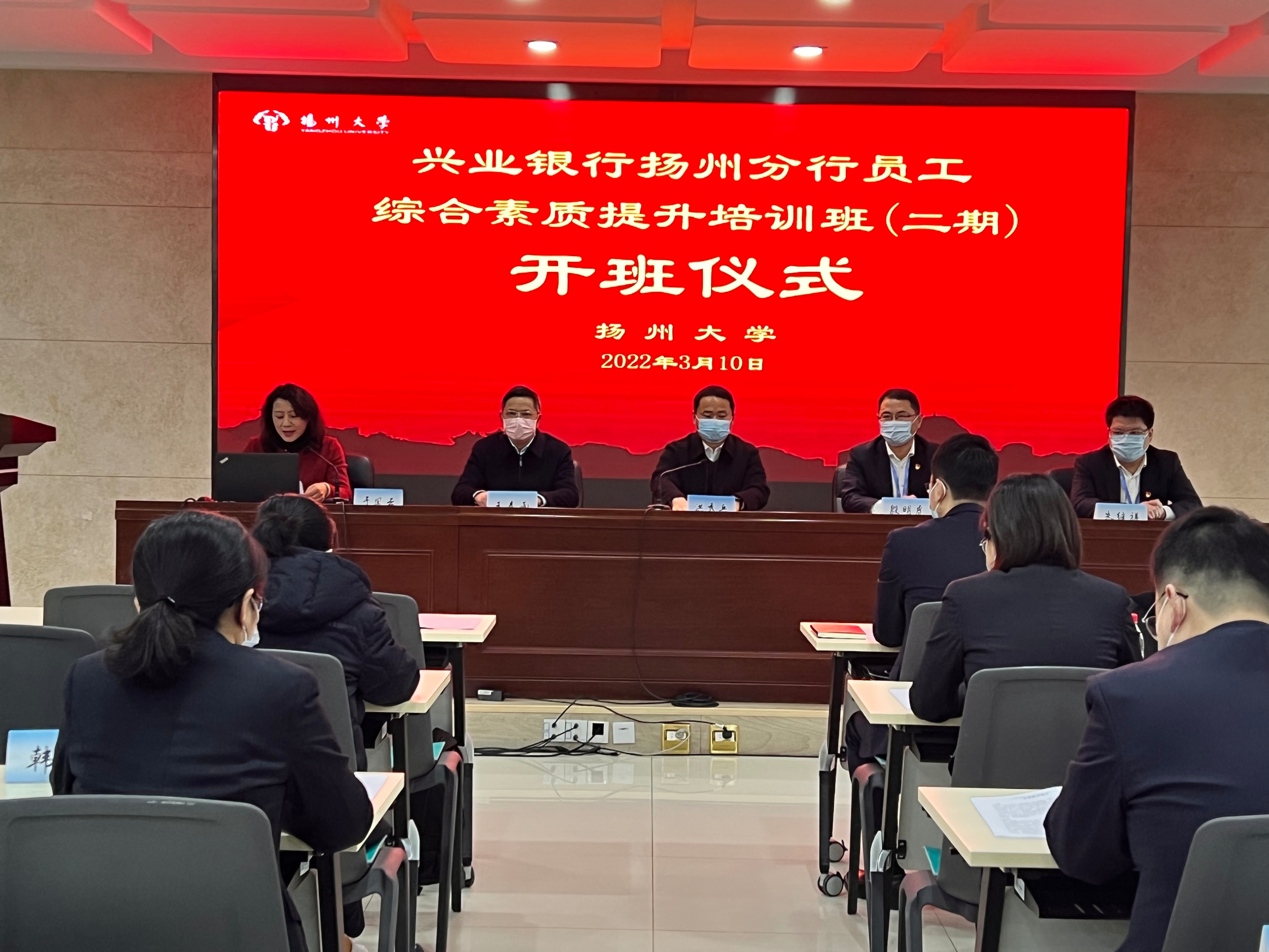 2022年3月10日,由我院承办的兴业银行扬州分行员工综合素质提升培训班在扬州大学瘦西湖校区举行开班。开班仪式由副院长于凤云主持。扬州大学继续教育学院副院长洪秀兵致辞,对参加本次培训的各位学员表示热烈欢迎,并希望各位学员在培训的过程中能够体验扬州大学的校园文化和扬州的人文环境,同时洪院长也强调了在本次培训期间,学员要严格遵守培训要求,服从培训纪律。兴业银行扬州分行行长殷明虎强调了本次培训的目的,希望各位学员能够在本次培训的过程中,认识到提高自我的重要意义,把握自我认识,加强自我修养,提升综合能力。
