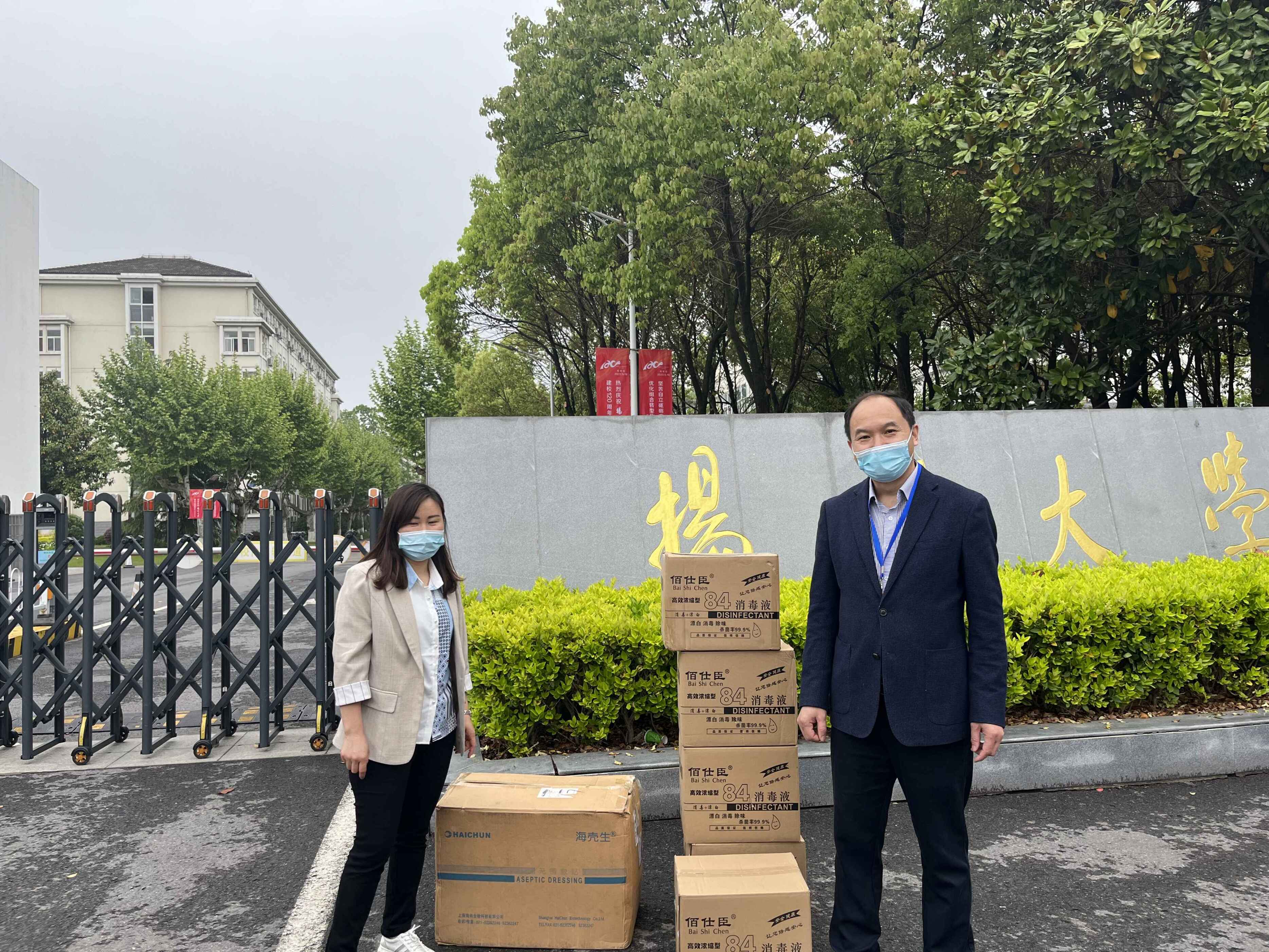 2022年4月26日,该生母亲将消毒液、防护服等物资送到瘦西湖校区大门口,交给物理科学与技术学院党委副书记高红明,并转达到该生的意愿:这是物理学院一名普通的学子对学院表达的一片感恩之情,感谢学院的教诲,同时为学院防疫工作尽自己的一点绵薄之力,希望学院不要宣传自己。