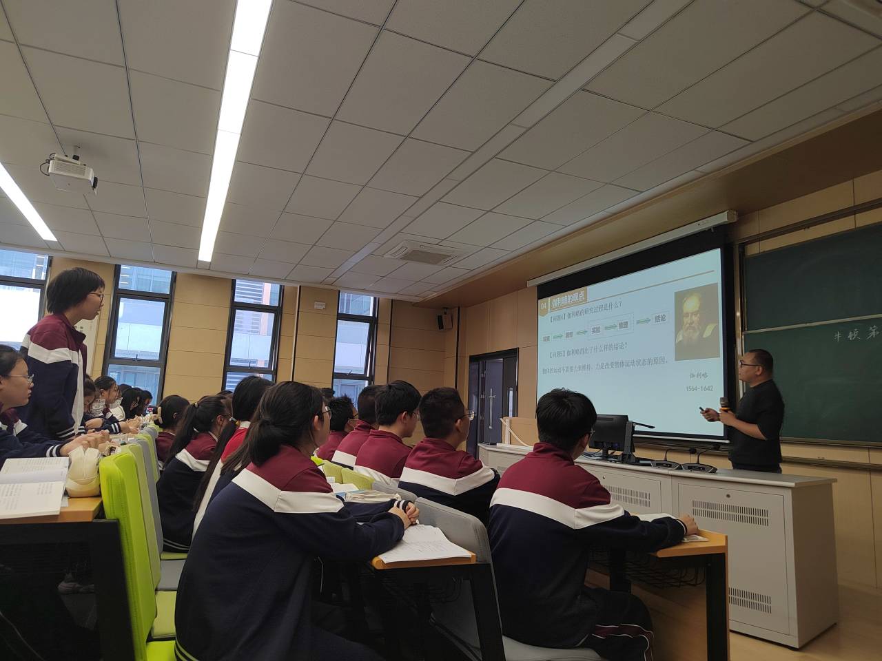 培训伊始,张鹏校长首先为见习学生介绍了树人学校的建校历史与教育定位。培训第一环节由袁鹏老师讲授高中物理《牛顿第一定律》,师范生现场观摩。袁老师的课堂以问题推进的方式,从情景引入、历史猜想、现场实验、物理应用四个方向结合展开知识点的讲解。其中,物理史与课本知识的融合、知识讲解与现场实验有机结合的授课方式,使我院学生在如何兼具知识教育与核心素养教育、提高课堂师生互动等方面收获诸多启发。