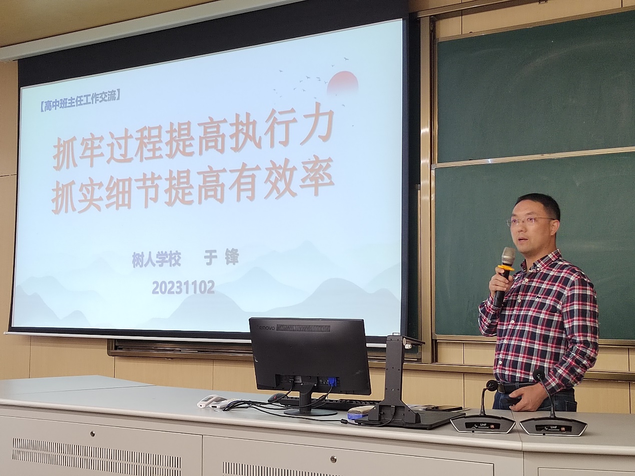 培训第二环节由于锋主任进行主题为《抓牢过程提高执行力 抓实细节提高有效率》的班级文化建设经验分享。作为执教经验丰富的班主任,于主任从自身体悟出发,为师范生们介绍了“以德为先、以爱为本、以理服人”的执教理念。随后,他以班级卫生、目标指引、家校沟通为主线向师范生们提出详尽的班级管理工作思路与策略。见习学生在认真聆听中积累了宝贵的实践经验。
