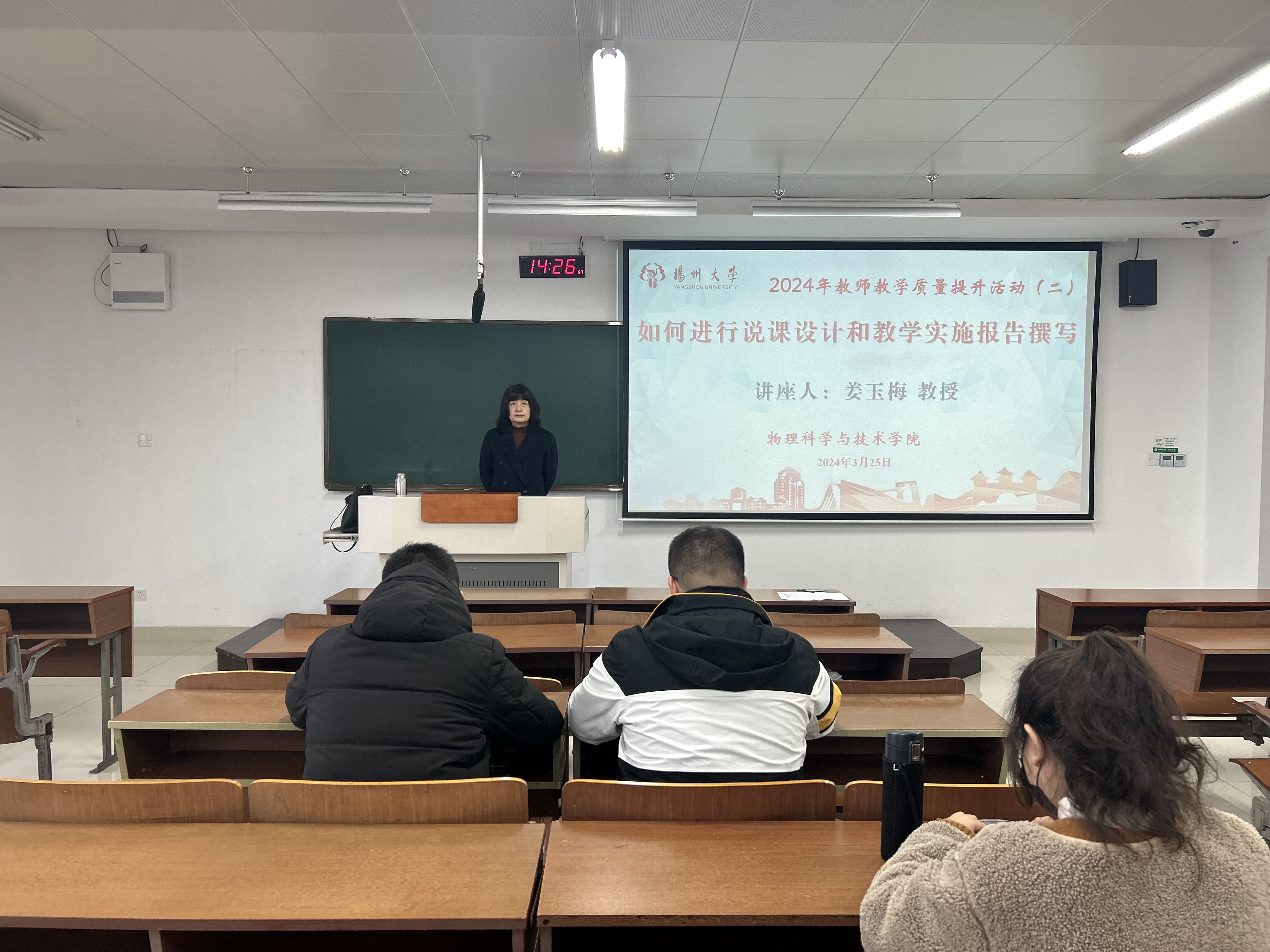 为激励新教师积极参与教学实践,提升教书育人能力,促进教学素养提升。3月25日,物理科学与技术学院邀请姜玉梅教授为青年教师开展“如何进行说课设计和教学实施报告撰写”的主题讲座。我院相关青年教师参与培训。