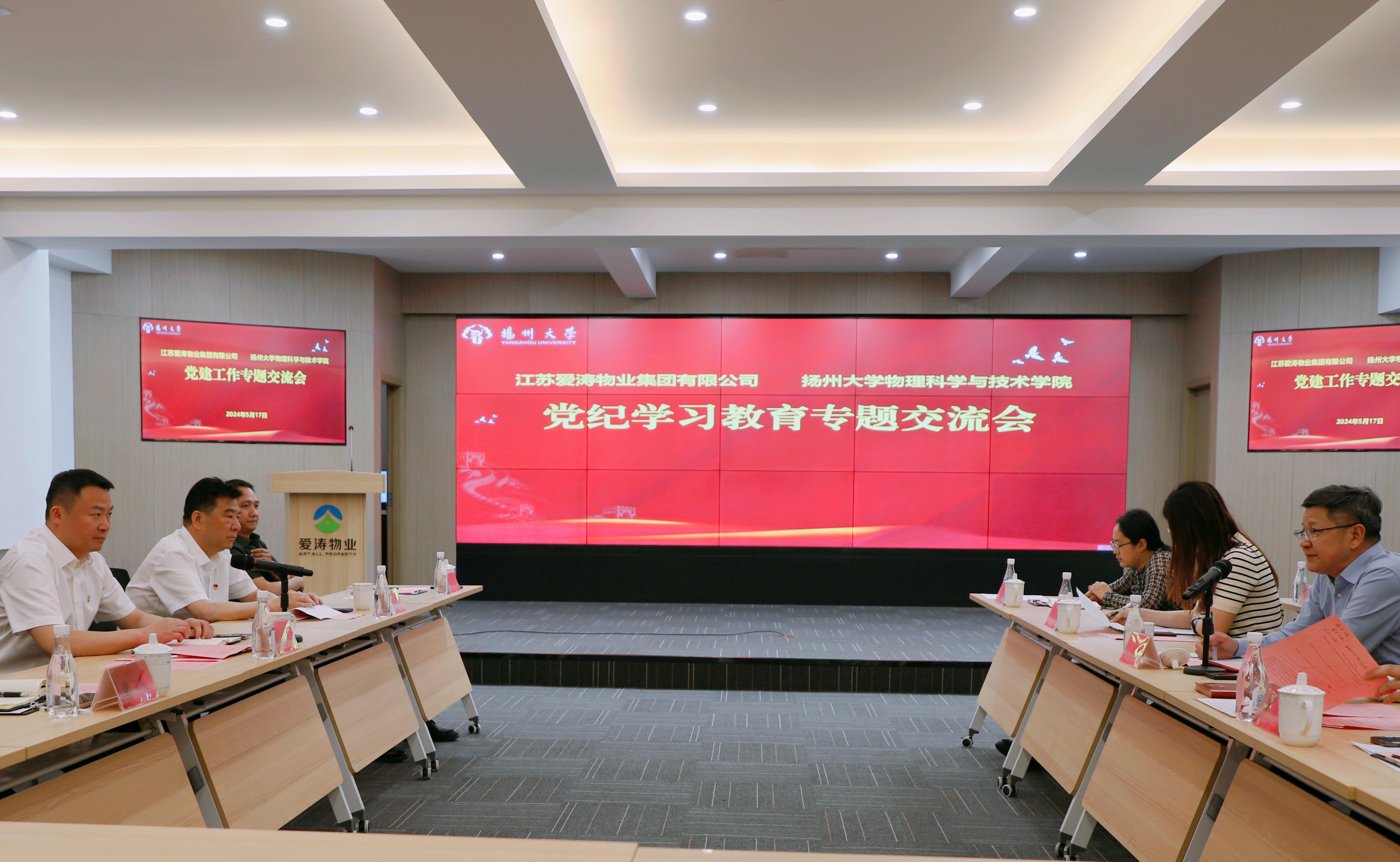 最后,江苏爱涛物业集团公司党委书记、董事长岳峻与学院党委书记王春雨就党纪学习教育的开展情况进行了深入的交流探讨。双方围绕加强党性教育、提高党员素质、推动党建工作与企业发展深度融合等议题进行讨论,并共同分享了在党纪学习教育中的优秀经验与做法,为双方未来的党建工作提供了有益的参考与方向。此次交流不仅加深了双方的友谊,更为未来的进一步合作奠定了基础。