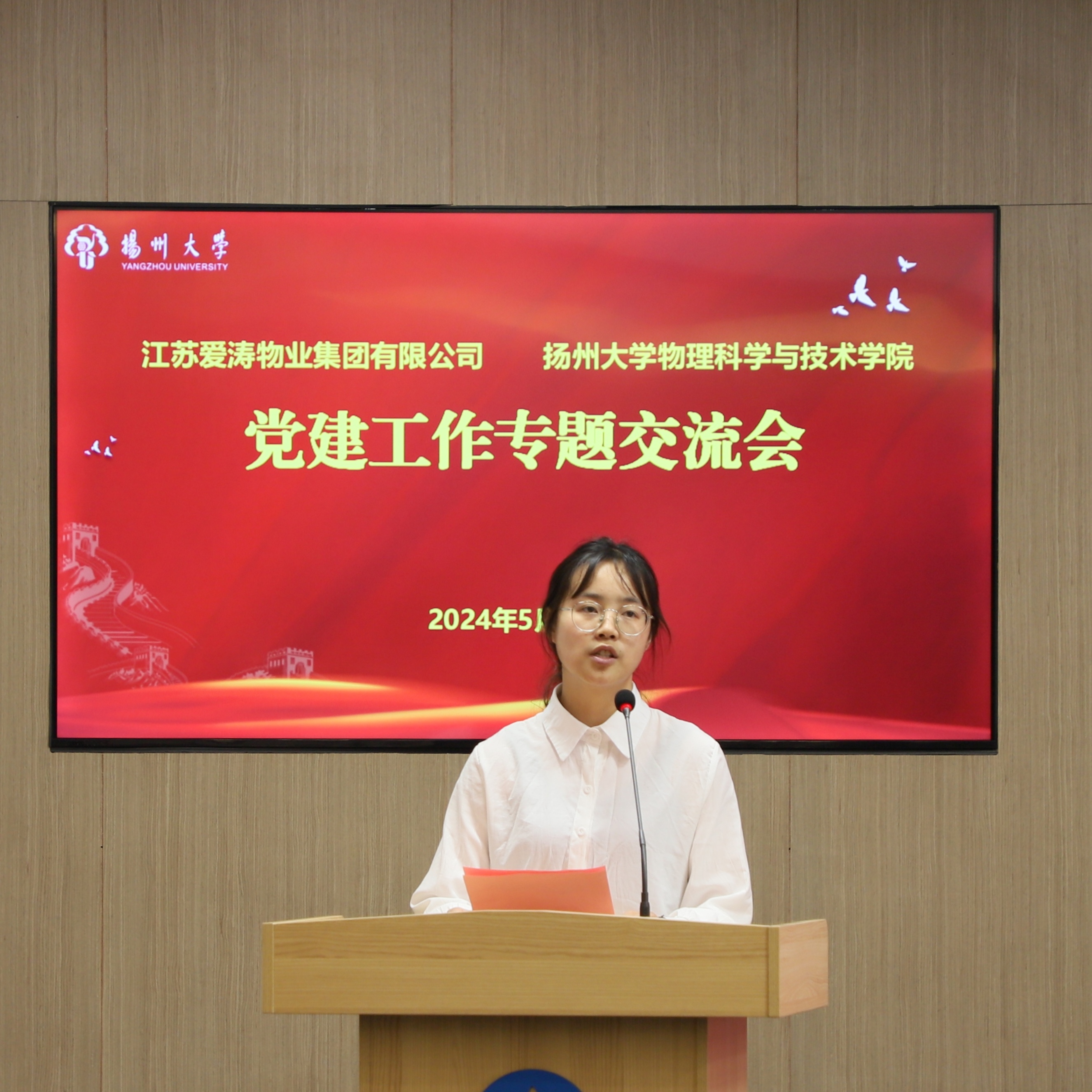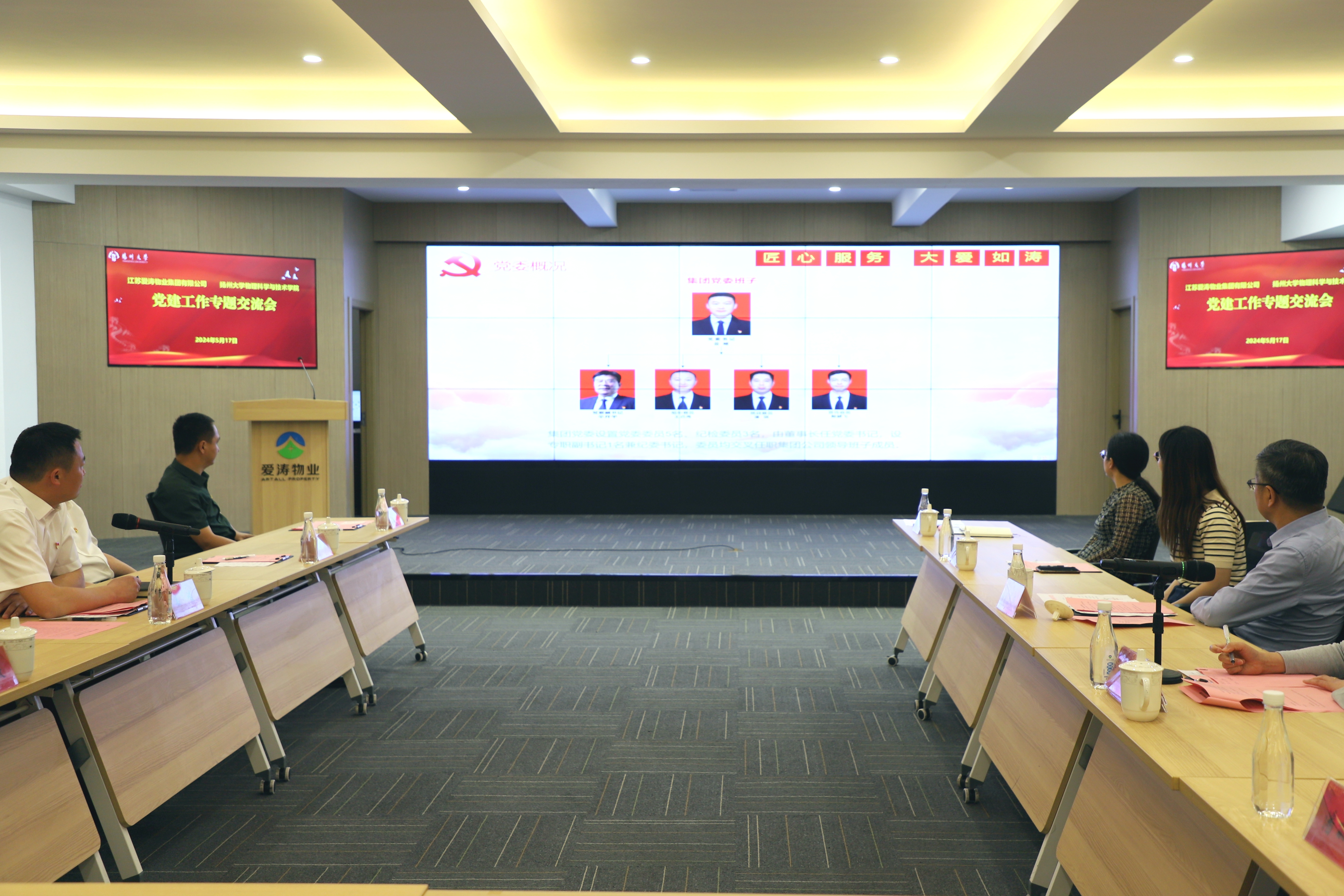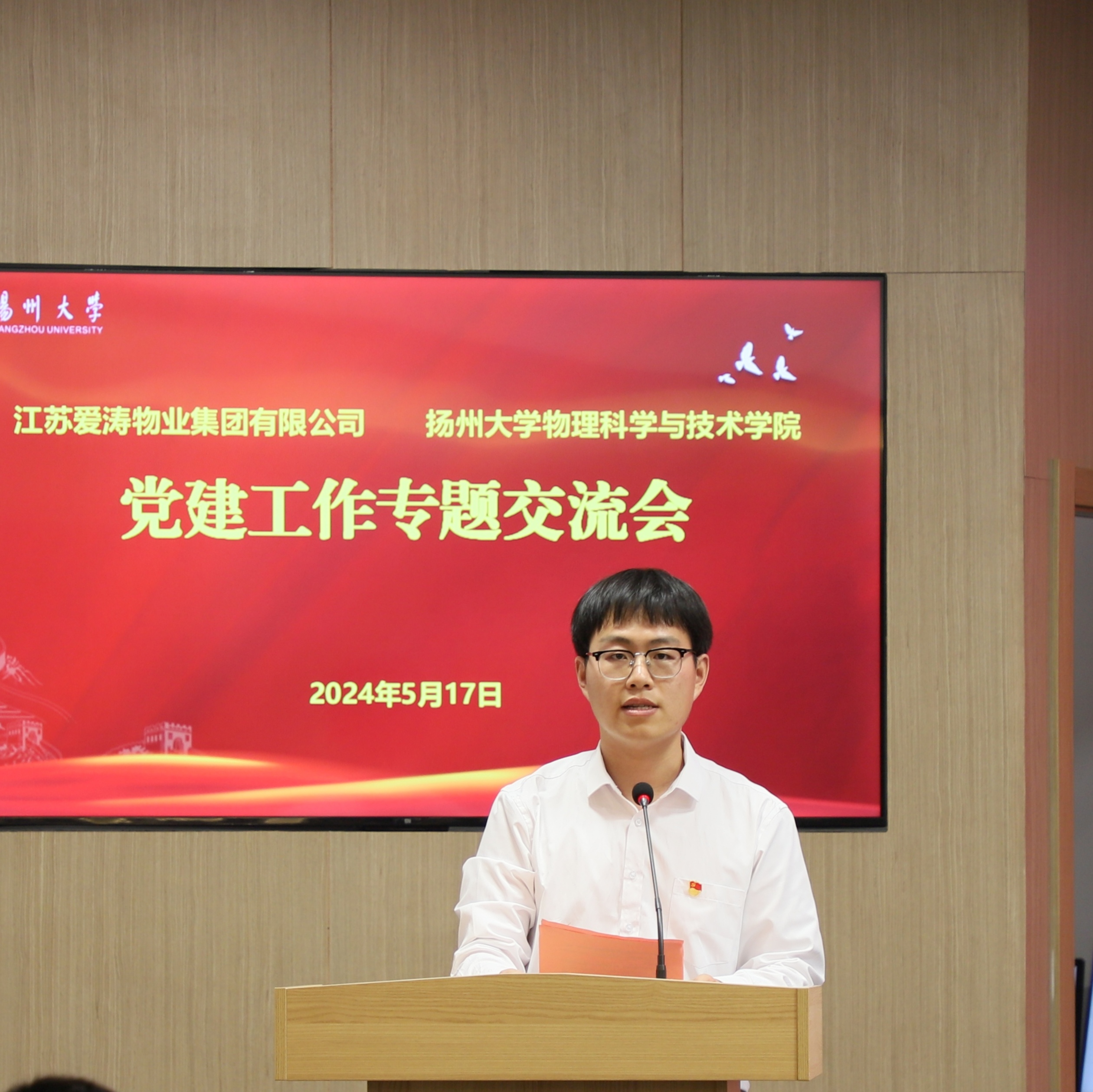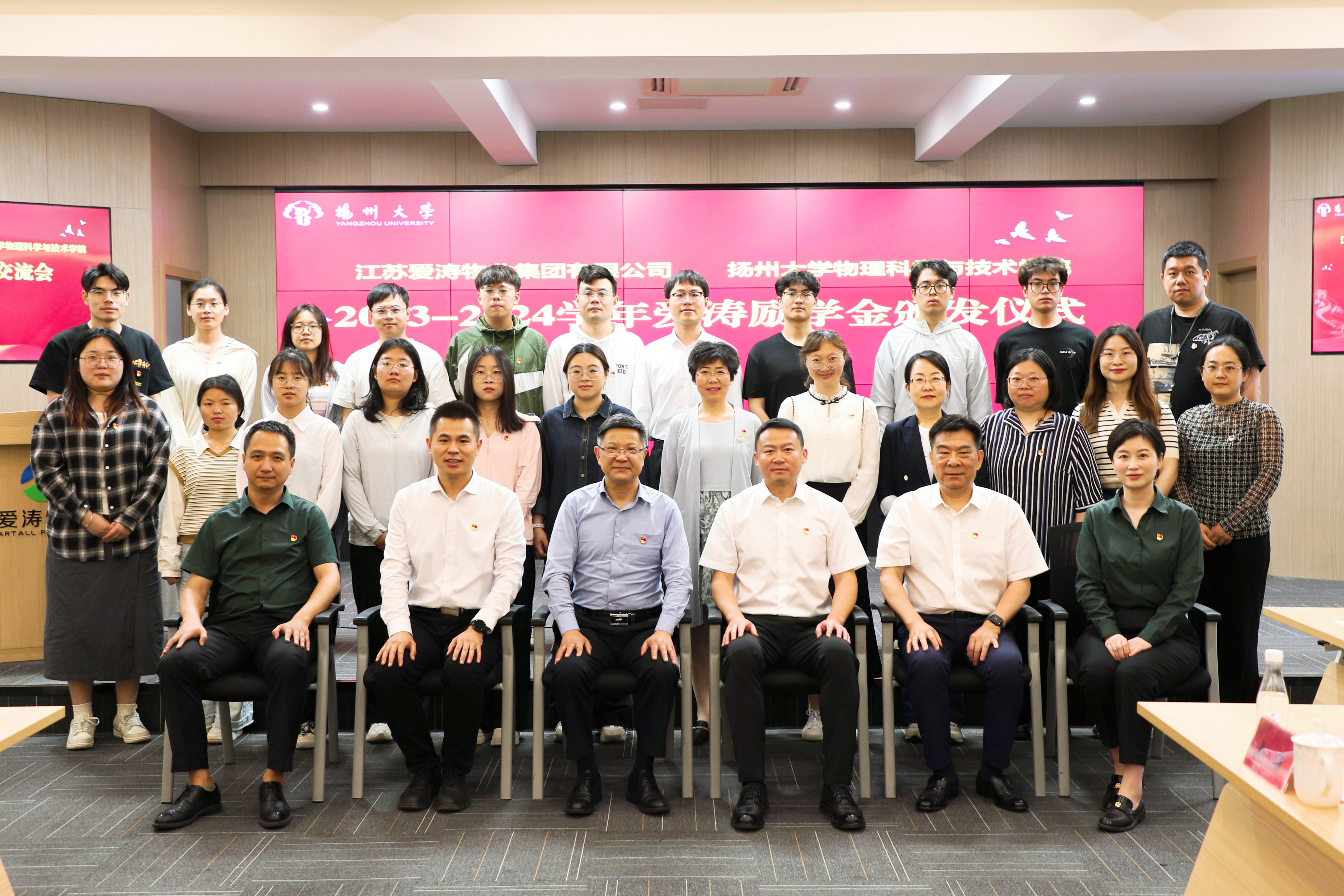5月17日下午,我院在江苏爱涛物业集团公司举行2023-2024学年爱涛励学金颁发仪式暨物理科学与技术学院党支部书记培训现场教学。江苏爱涛物业集团公司党委书记、董事长岳峻,江苏爱涛物业集团公司党委副书记辛开平,江苏爱涛物业集团公司行政人事总监倪敏,江苏爱涛物业集团公司党群部主任魏琨,江苏爱涛物业集团公司品牌经营部经理、团委书记冯扬,院党委书记王春雨,院综合办公室主任王艳,院教职工党支部书记、支部委员代表潘丽华、徐秀莲、樊莉,院学生党支部书记戴娟、张月明、郭汉涛、华如楠、许武韬出席本次会议,学院2023-2024学年爱涛励学金获奖者和学生代表参加会议。会议由院党委副书记毕瑜林主持。