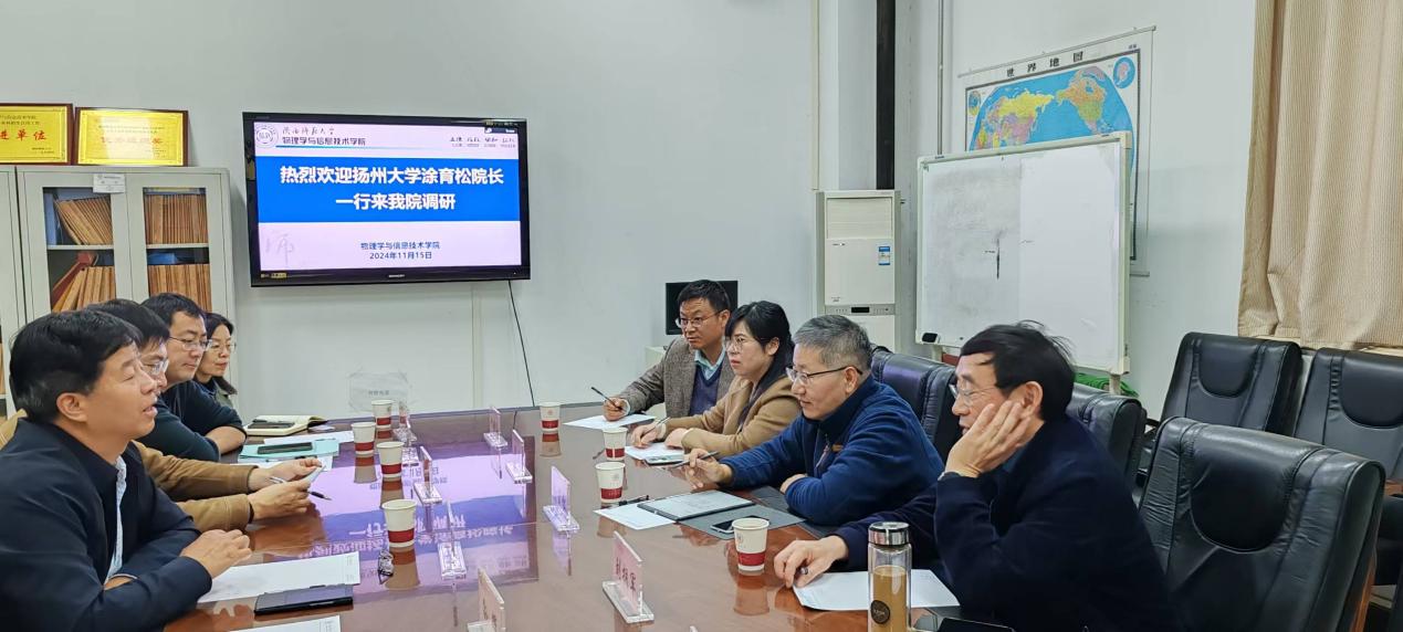 2024年11月14日至16日,院长涂育松教授率领调研团队一行五人,赴陕西师范大学物理学与信息科学院,围绕物理师范专业建设的关键议题开展调研与学术交流。调研团队由扬州大学物理名师工作室负责人刘拥军教授、大学物理教学部主任潘靖教授、物理学专业副主任兼物理师范专业负责人王强教授,以及物理师范专业骨干教师叶晓山副教授共同组成。陕西师范大学物理学院党委书记王启明、院长李贵安、教学副院长高健智及多位物理师范专业骨干教师共同参与并主持了相关活动。