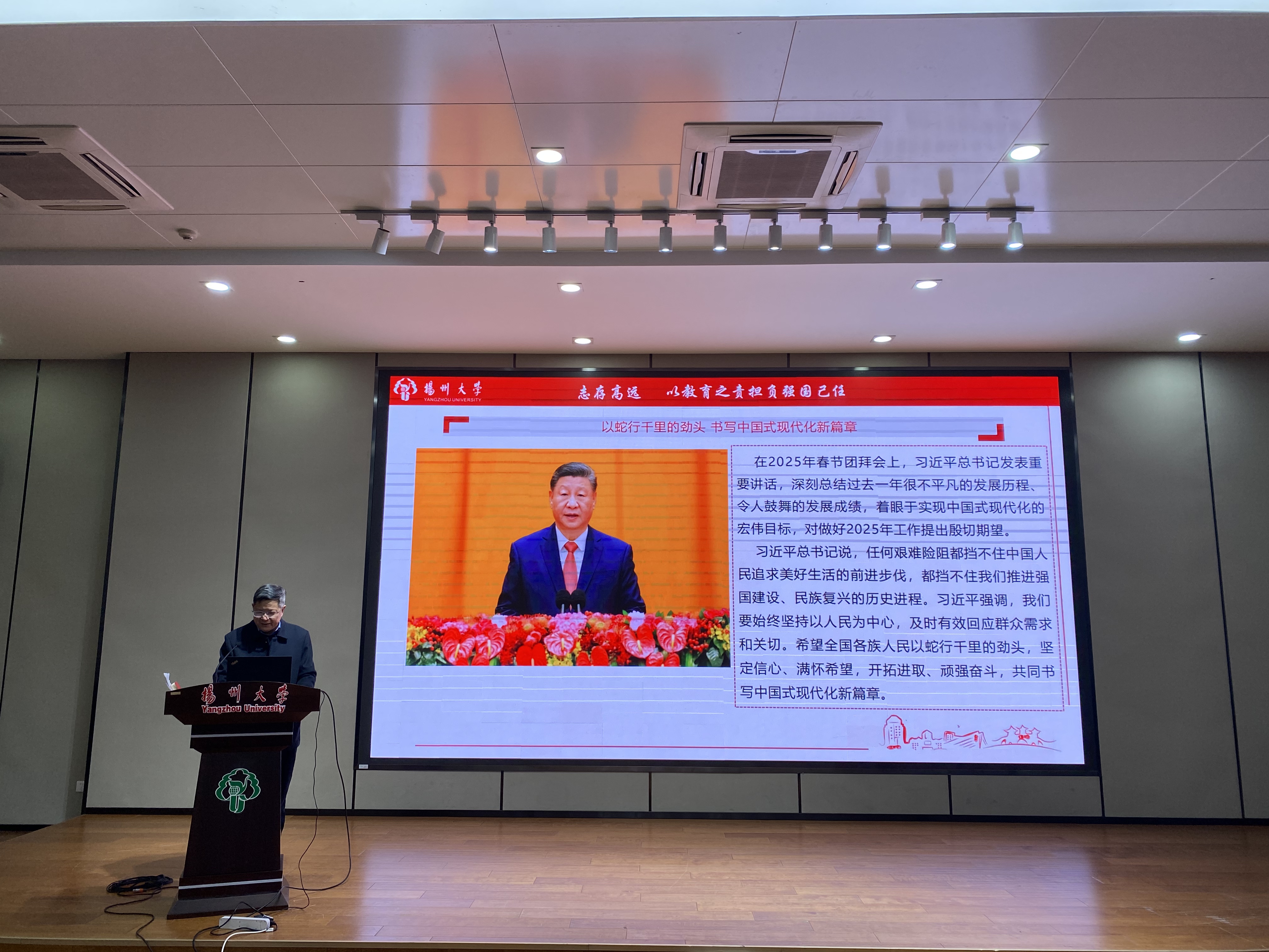 王春雨书记传达丁建宁书记在中共扬州大学第四届委员会第四次全体(扩大)会议上的讲话以及在2025年春学期干部教师大会上的讲话精神,并带领全体教职工开展了“开学第一课”学习。