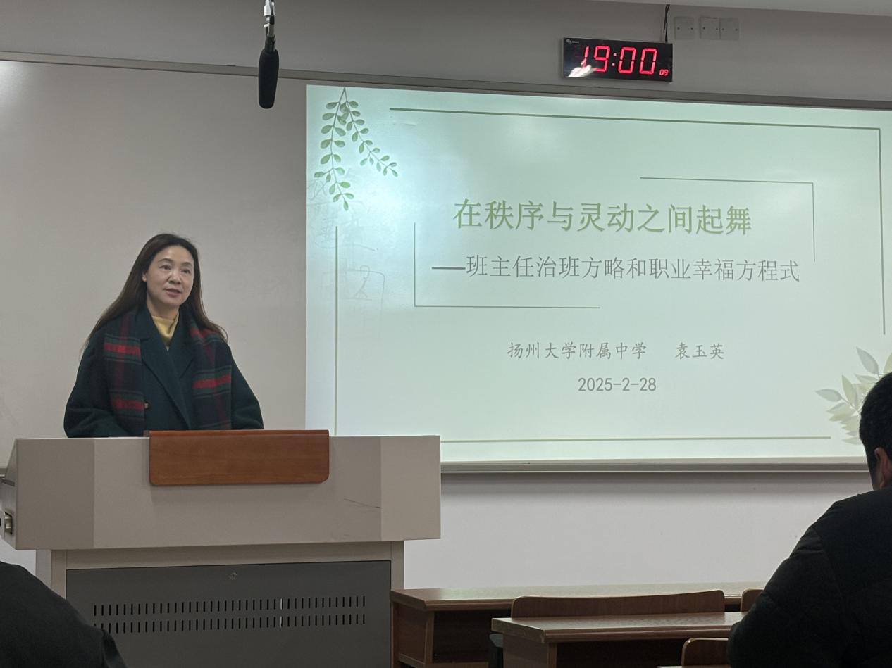 为提升师范生的班级管理能力与职业素养,2022级物理学师范专业于2025年2月28日开展了本学期第二节“班主任工作”课程。本次课程特邀扬州大学附属中学副校长袁玉英担任主讲,主题为“在秩序与灵动之间起舞——班主任治班方略和职业幸福方程式”。袁校长结合自身丰富的教育经验,通过生动的案例分享,为学生们带来了一场理论与实践深度融合的精彩课程。