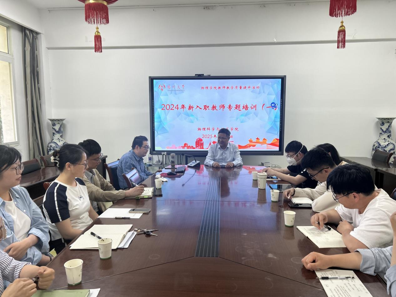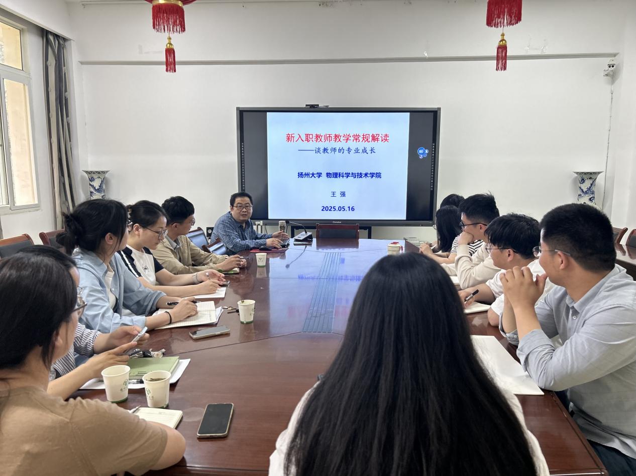 5月16日,学院举办2024年新入职教师教育教学专题培训讲座(一),院党委书记王春雨出席活动并做总结讲话。物理系副主任王强教授以“新入职教师教学常规解读——谈教师的专业成长为题,为11名新入职青年教师作专题培训。王强教授从教学规范、科研融合、教师成长三方面展开讲解,结合《扬州大学本科生课堂教学听课记录表》的具体指标,强调青年教师需严格遵循教学资料准备、课堂管理、课程思政等基本要求。他通过“拔河力学实验”“冰壶旋进分析”“STEAM牛奶拉花项目”等教学案例,生动阐释了“科研反哺教学”的实践路径,并建议新教师通过教学竞赛、名师引领、科研转化等方式实现从“准教师”到“特色教师”的专业成长。
