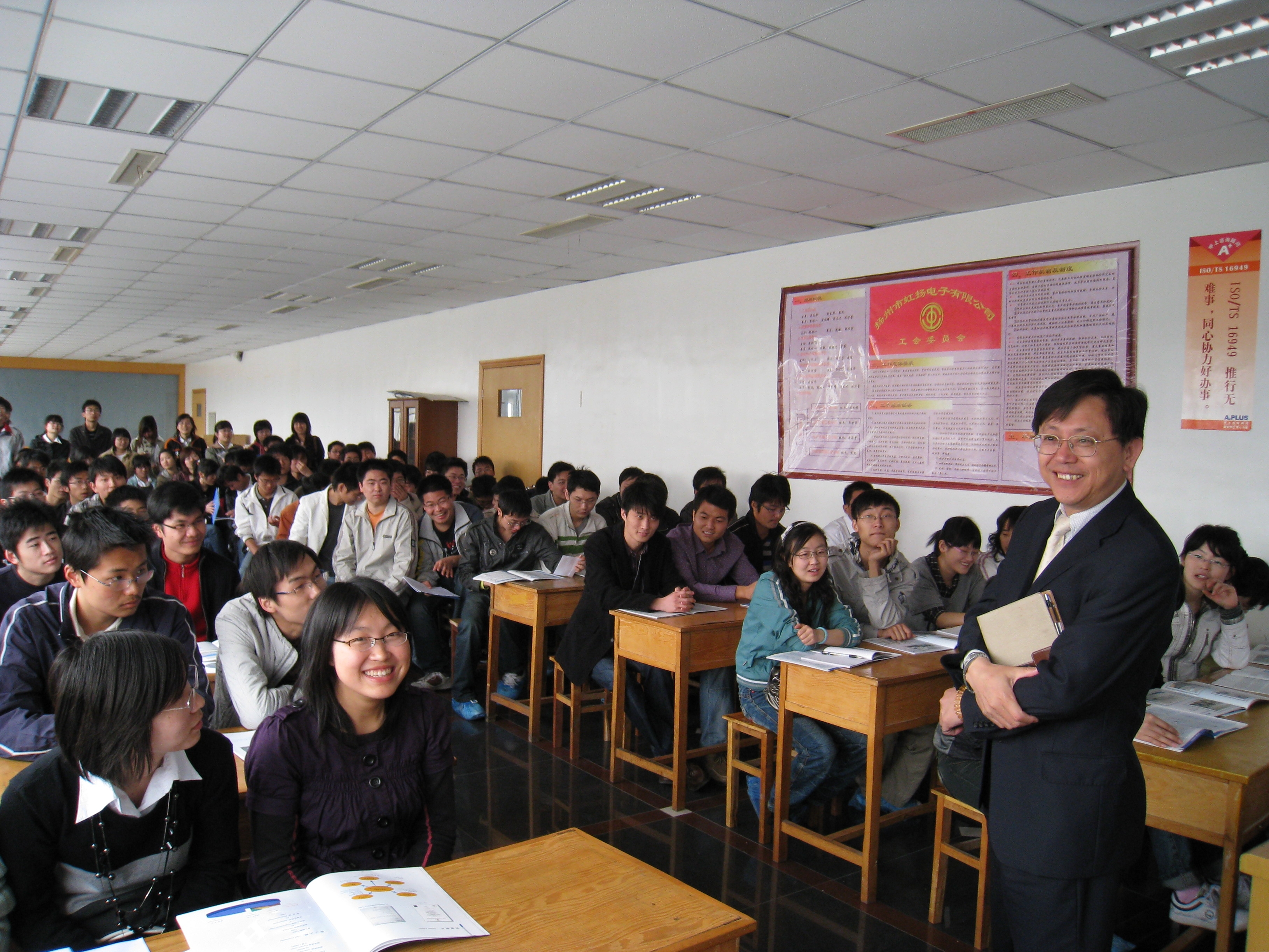 近日,我院电科和微电专业的近百名学生,来到扬州虹扬电子有限公司参观。此次参观,有着极为特殊的意义:我院将有近20名应届毕业生与公司签约,不仅如此,该院还将与虹扬电子在建立实习培训基地的基础上,确定一系列譬如在公司设勤工助学岗位、建立交流论坛等长效合作机制。参观结束后,虹扬电子总裁、扬州台商协会会长方丁玉先生为同学们作《放低姿态,准确定位》的交流发言,并现场解答了同学们的疑惑。方总认为,受金融危机影响,许多企业或倒闭或裁员,致使目前部分高校毕业生处于一种十分尴尬的境地。要想成功就业,就必须对自身有准确定位。此次参观交流,许多同学开始意识到,要想成功完成人生这部书,就必须读懂社会这本书。