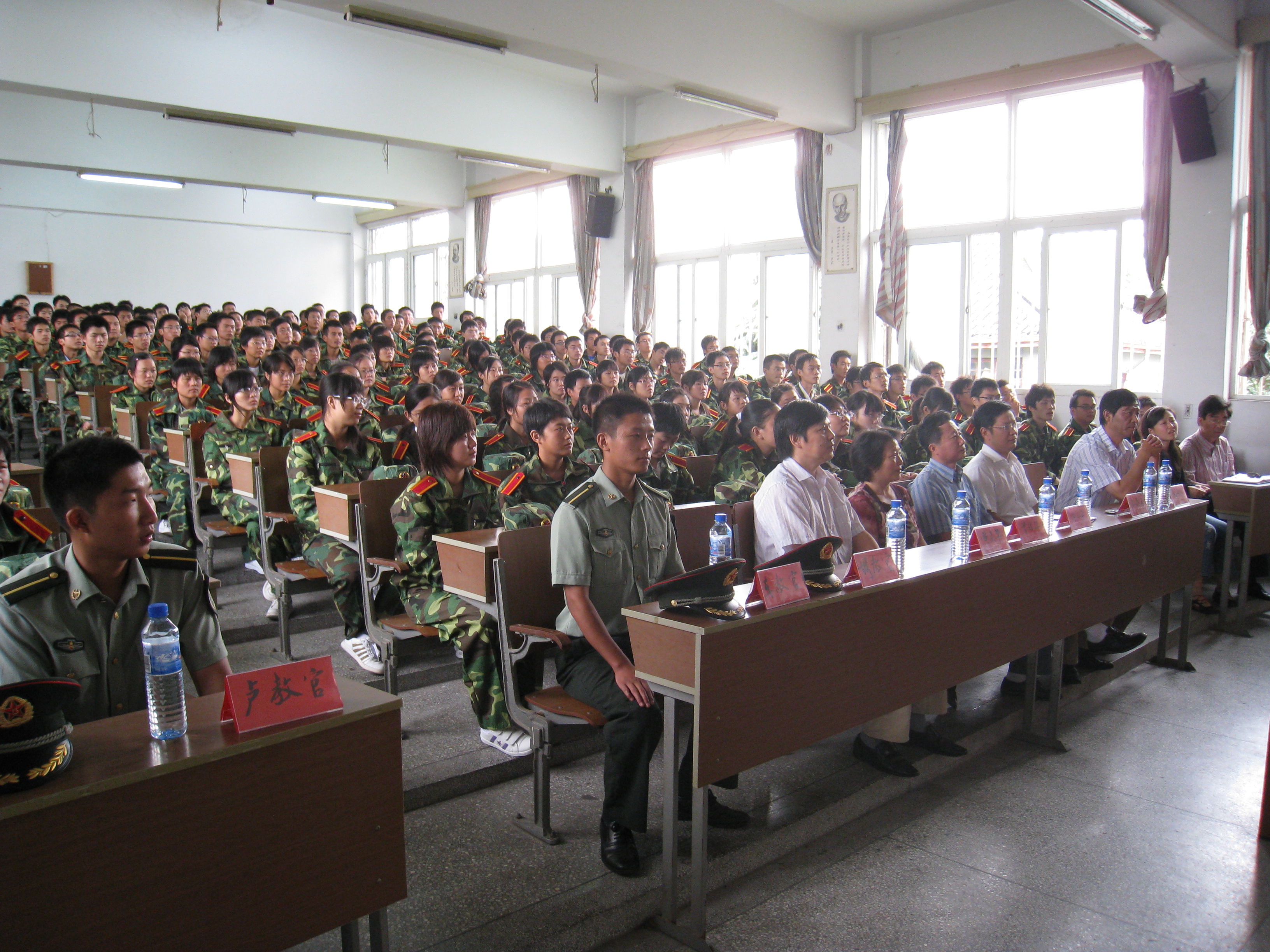 9月9日上午,我院于西附二楼召开2009级新生开学典礼暨军训动员大会。院党委黄庆华书记、陈小兵院长、沈秋林副书记、胡经国副院长、曾祥华副院长、王春雨副院长及部分教师代表、三位军训教官、团委邹明玮副书记、辅导员杨绍琼老师,213名2009级新同学参加了会议。