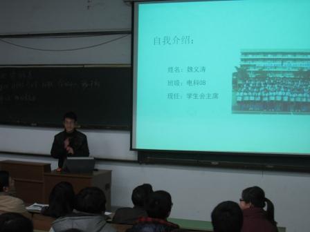 用心交流,用爱倾听——我院举办先进班集体评审暨班集体建设经验交流会 3月21日晚,我院在西附二楼举行先进班集体评审暨班集体建设经验交流会。会议除了对有资格申报省级先进班集体的两个候选班级——电科08和微电08进行了展示评审外,还请2009、2010级班级建构比较优异的三个班进行了经验交流。院党委王春雨副书记、团委邹明玮副书记及部分班主任,全院主要学生干部出席了评审交流会。