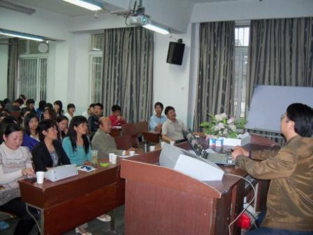 由江都中学的吴霞老师带来的“浅谈物理‘说课’的方法和技巧”的讲座,深入浅出地告诉大家说课说什么及怎么说的问题。演讲中,吴霞老师洪亮的声音,诙谐幽默的语言将大家带进了说课的世界。她走入同学中和同学们积极互动,从说教材、说教法和学法、说教学过程开始,为全体师范生剖析了物理教学过程的中的三维目标、一般环节和说课过程中所需注意的问题。