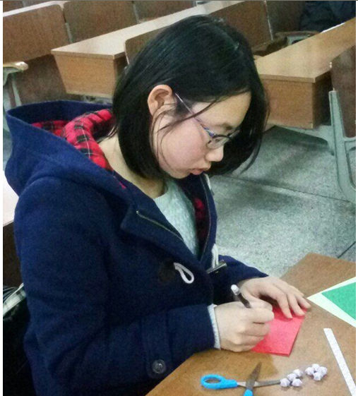 本次比赛共分为三个环节。第一环节,参赛者需将规定的六样折纸折好,由评委根据其满意程度打分,平均分最高者获胜。选手们有条不紊地上下翻折着手中的彩纸,时而低头思考,时而又拿起来仔细地对照着图样,神情十分专注。其间,选手们还互相帮助,解决遇到的困难,气氛十分温馨。不一会儿,一只只栩栩如生的蝴蝶、青蛙、小船便诞生了。接下来的第二环节,要求参赛者在规定的时间内折出星星,数量越多,分数越高。比赛在不知不觉间变得紧张起来,选手们屏气凝神,不敢有丝毫懈怠,脑中就像有一根细线紧紧地绷着。最后是难度最高的剪纸环节了。选手需要根据PPT上展示的扬大的标志性建筑和图标以及扬州的美丽风景图片剪出作品,评委根据相似程度打分,平均分高者获得第三环节的胜利。这时比赛现场十分安静,只有裁纸的沙沙声和剪刀放在桌上发出的声音。选手们又剪又折,享受着这个充满乐趣的动手过程。最后,1号选手施志敏凭借自己创意的思维和灵巧的双手获得了本次比赛的最终胜利。