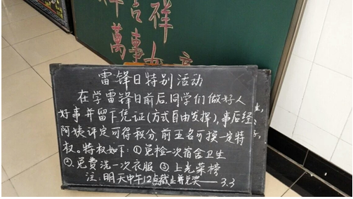 活动组织者之一的李阿姨介绍,又到一年学雷锋日,各大高校都在引导学生学雷锋作好事,但是如何吸引学生、让他们积极主动参与成了难题。“大学生自主意识强,引导的方式又不能太严肃。”李阿姨说,经过3位宿管阿姨的商量,就在宿舍楼道间的小黑板发布了“学雷锋”征集令,即通过做好事兑换积分,用积分兑换特权。