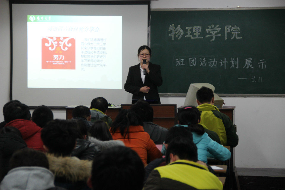 主持人致简短的开幕词后,12位班级代表纷纷上台,演说、展示各班级本学期的班团活动计划。首先上台的是物理13的活动委员蔡媛媛。她向我们展示了物理13本学期的班团活动总策划:雷锋月学雷锋;花样女神之女生节庆祝活动;为放松解压、提高同学合作能力的寻宝活动及儿童节欢聚活动;为同学们接下来进修做准备的考研经验交流会;贴合教育专业课程的粉笔字大赛;以及临近考试时举办的诚信考试主题班会。活动内容丰富多彩,既增强了班团活动的趣味性,又贴合了学生的学习、生活。十分生动具体,一开始就给人以不错的印象。接下来上台演说展示的是光科14的宋庆坤。他所在的班级计划开展一系列充满趣味性的班团活动——荧光夜跑、趣味运动会、光科14节等等。第三个主讲人是光科15的庄志康,他们班级的活动主题大部分与节日相关,流利的演说给人留下良好的印象。紧接着是物理15的班长王慧娟。她先介绍了三月份已经开展过的班团活动和那时的图片资料,然后为我们讲述了未来几个月准备开展的活动,大方自然的台风很受欣赏,即使声音时不时无法从话筒里穿出,但她依旧镇定地把自己的演说继续下去。