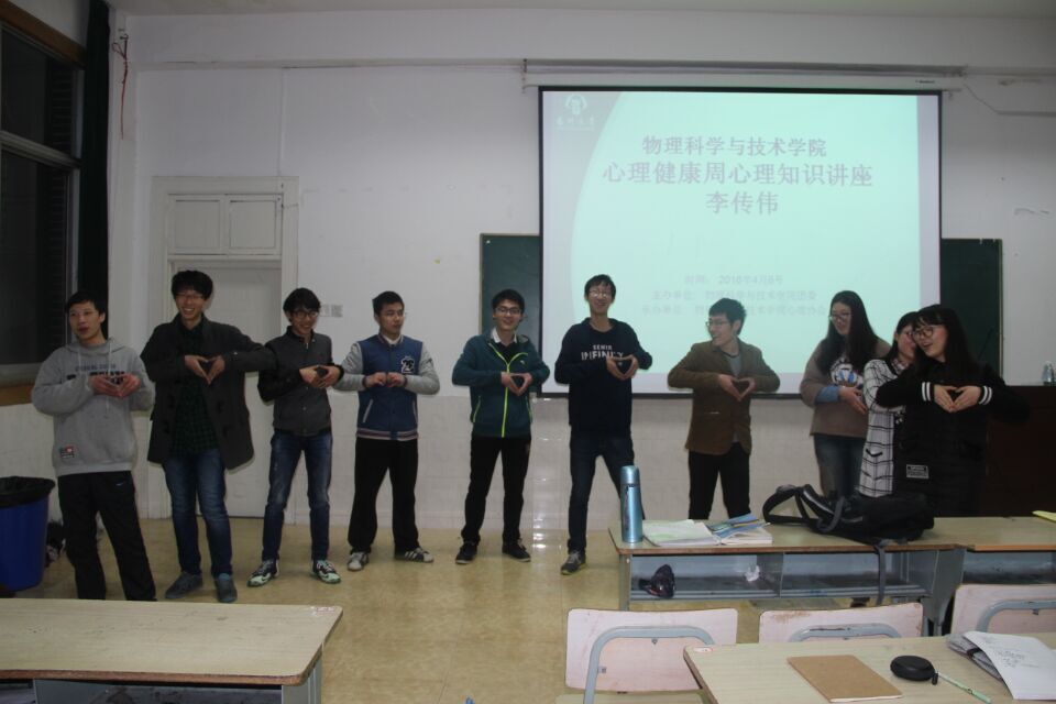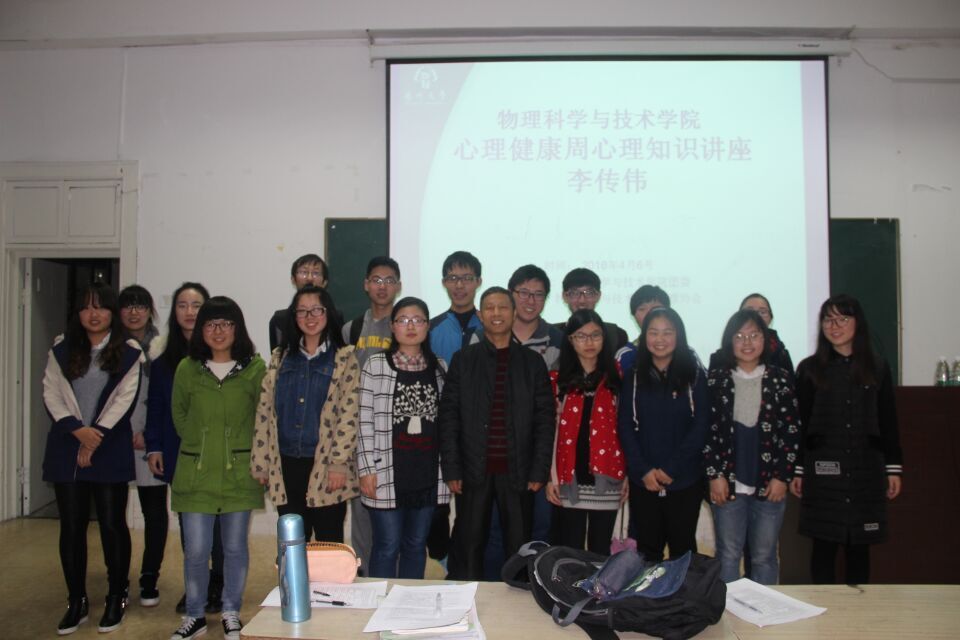 爱,来自你我——物理学院成功举办心理健康周心理知识讲座 4月6日晚,我院在文科楼成功举办心理健康周心理知识讲座。此次讲座由物理学院团委主办,我院心理协会承办。讲座有幸邀请了教育科学学院的李传伟老师为讲座的主讲人,我院团委毕瑜林出席本次讲座。