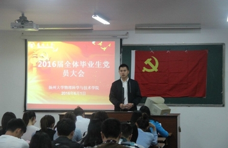 铭记职责使命 争做合格党员——我院举办2016届毕业生党员大会 为充分发挥党员的先锋模范作用,切实做好毕业生文明离校工作,我院于6月1日下午五点在物理楼219召开了2016届全体毕业生党员大会。院党委副书记王春雨老师,综合办公室副主任兼组织纪检员刘海涛老师,团委毕瑜林老师,张月明老师以及全体2016届毕业生党员参加了此次大会。