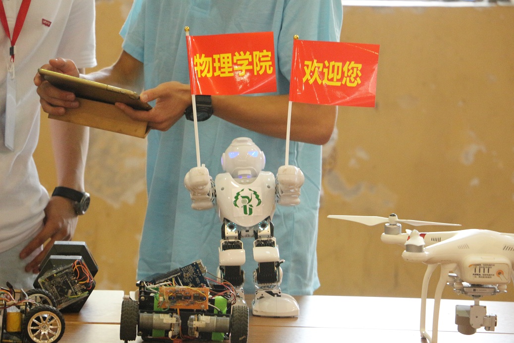 “快看,这里有神秘机器人!”,现场传来这样一阵声音,原来是物理学院学生在导师带领下自行设计完成的机器人,手举两面小红旗,小旗上印着“物理学院欢迎您”,就如一只物理学院专属的吉祥物;另一台无人机的展示则更加精彩,学生操控无人机,盘旋在体育馆的空中,遥控指令,飞遍整个体育馆,让新生都看到物理学院的光芒,随之而起的呼呼风声令在场的人拍案叫绝,机下悬挂的红色字符“物理学院欢迎您”更是集聚了所有人的目光,循迹小车、智能家居系列作品 、Wifi小车 ······一系列科技创新和专业技术,凝聚着他们的智慧与汗水,发扬了物理学院理论与实践,创新与个性相结合的精神,展现了科技与智慧的光芒,为迎新现场增添了一抹靓丽的色彩!