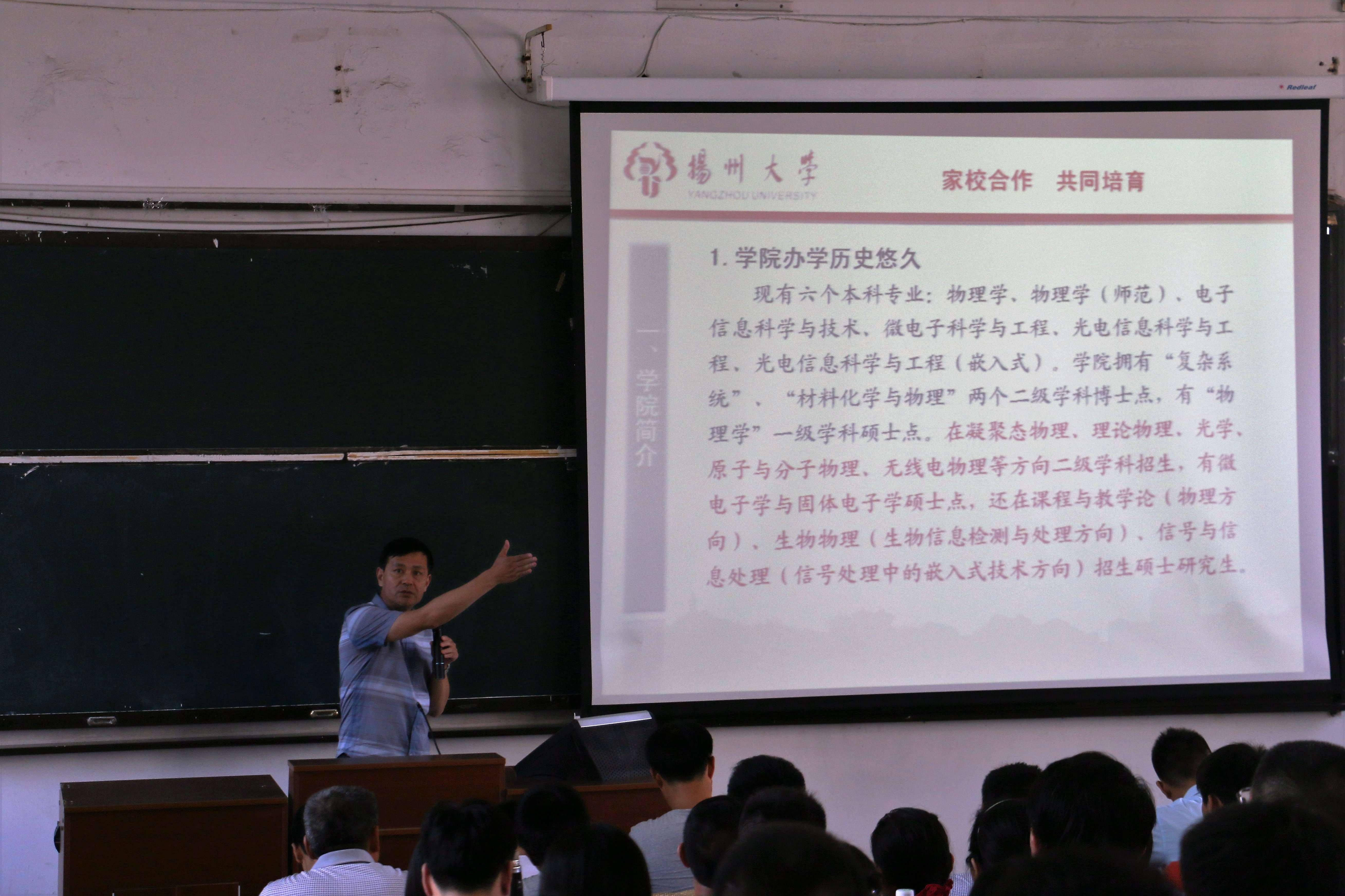 家校合作 共同培育------物理学院召开2016届新生家长见面会9月3日下午,物理科学与技术学院在物理楼西附二楼召开了2016届新生家长见面会。院党委副书记周春开老师,院团委负责人毕瑜林老师,张月明、戎晨老师出席了本次会议。此次会议以“家校合作,共同培育”为主题,从多种层面立体地向新生家长展现物理学院优秀良好的精神风貌。