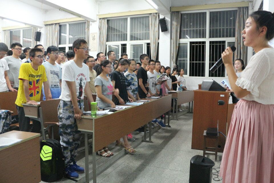 9月5日晚上,物理学院2016级全体新生在物理楼西附二楼学唱扬大校歌,领会扬大独特的校园文化。