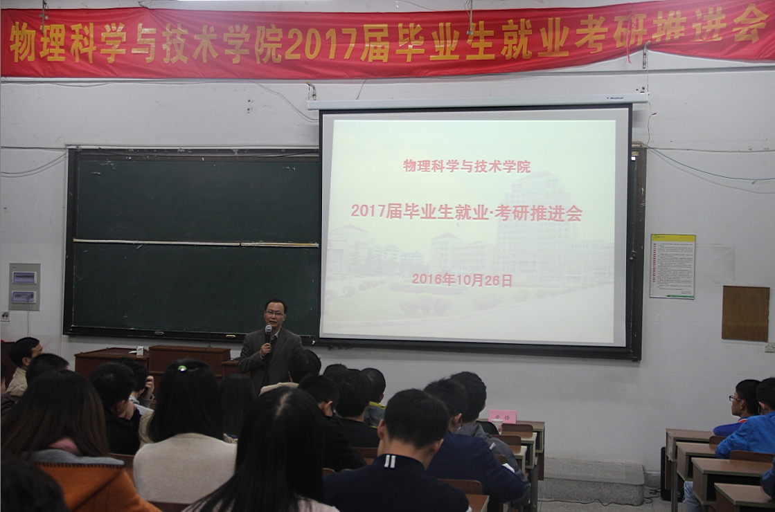 物理科学与技术学院成功召开2017届毕业生就业•考研推进会 10月26日下午,物理科学与技术学院在物理楼西附二楼成功召开了以“毕业生就业、考研”为主题的年级大会。出席本次会议的有院党委副书记周春开老师,学生处副处长、校就业指导中心主任陈克勤老师,校研究生院副院长吉丹如老师,物理学院副院长王健老师,院团委书记黄锋老师,以及班主任和各专业老师等,全体毕业生参加了本次大会。