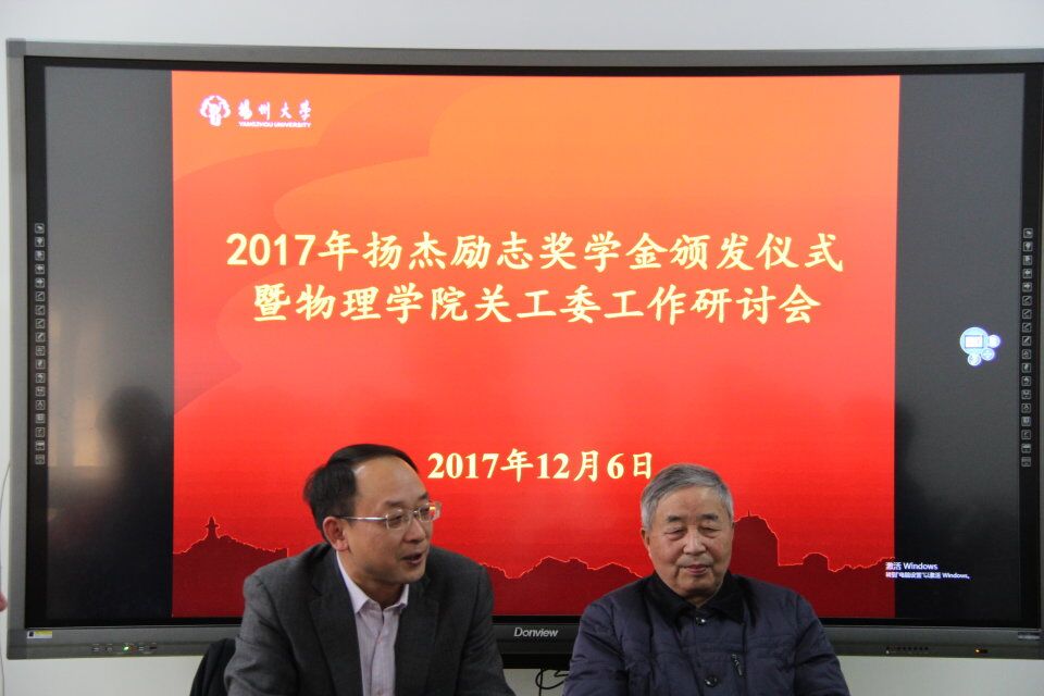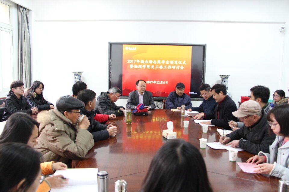 学院2017年关工委工作总结会暨扬杰励志奖学金颁发仪式 12月6日,学院于物理楼213举行了院关工委工作总结会和扬杰励志奖学金颁发仪式。出席本次会议的有校关工委梁隆圣老书记、刘方云主任、王庆林主任,院党委书记王春雨老师及院关工委的各位老师。院党委副书记周春开老师主持了本次会议,参加此次仪式的还有各位获奖同学。