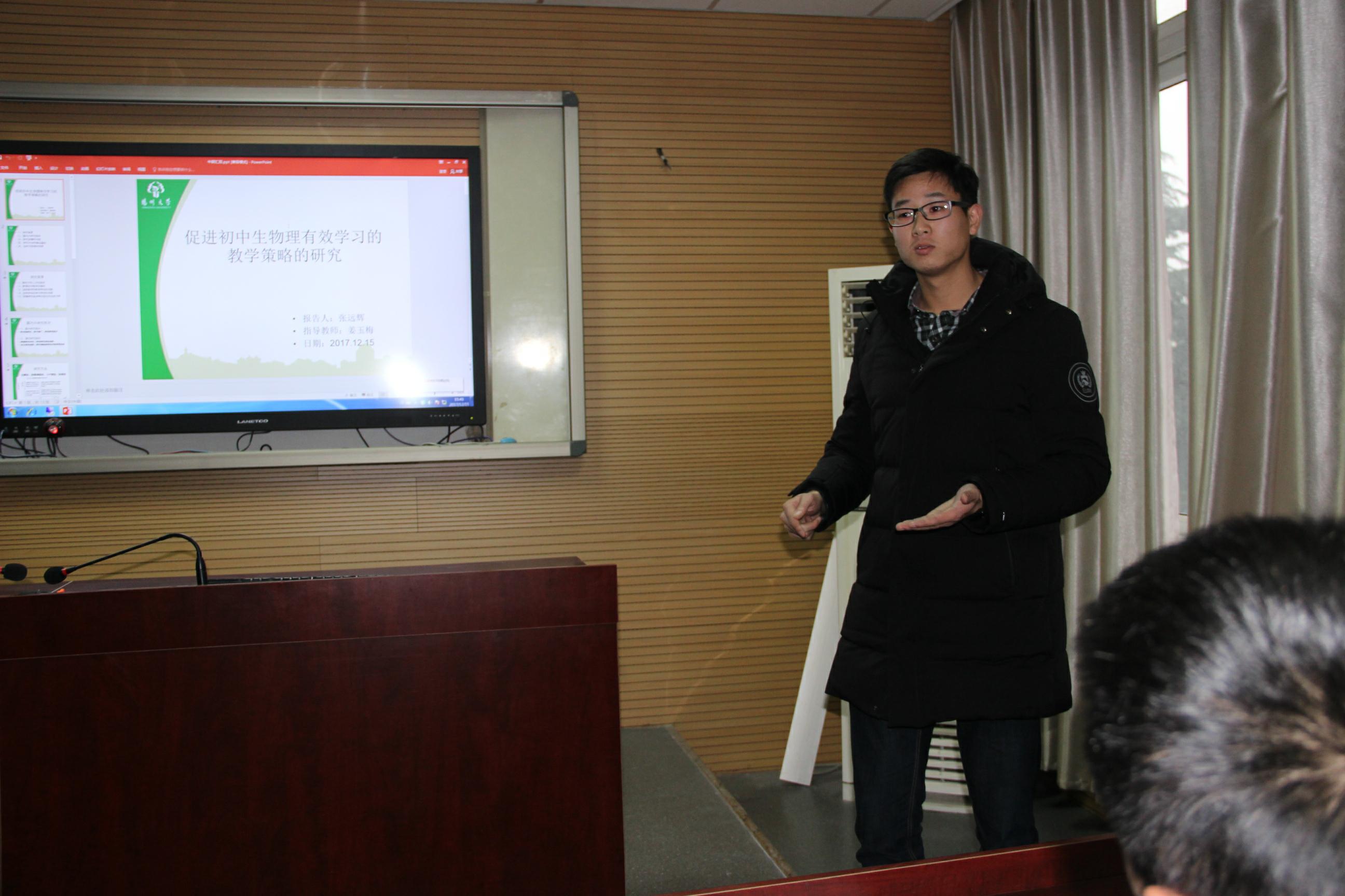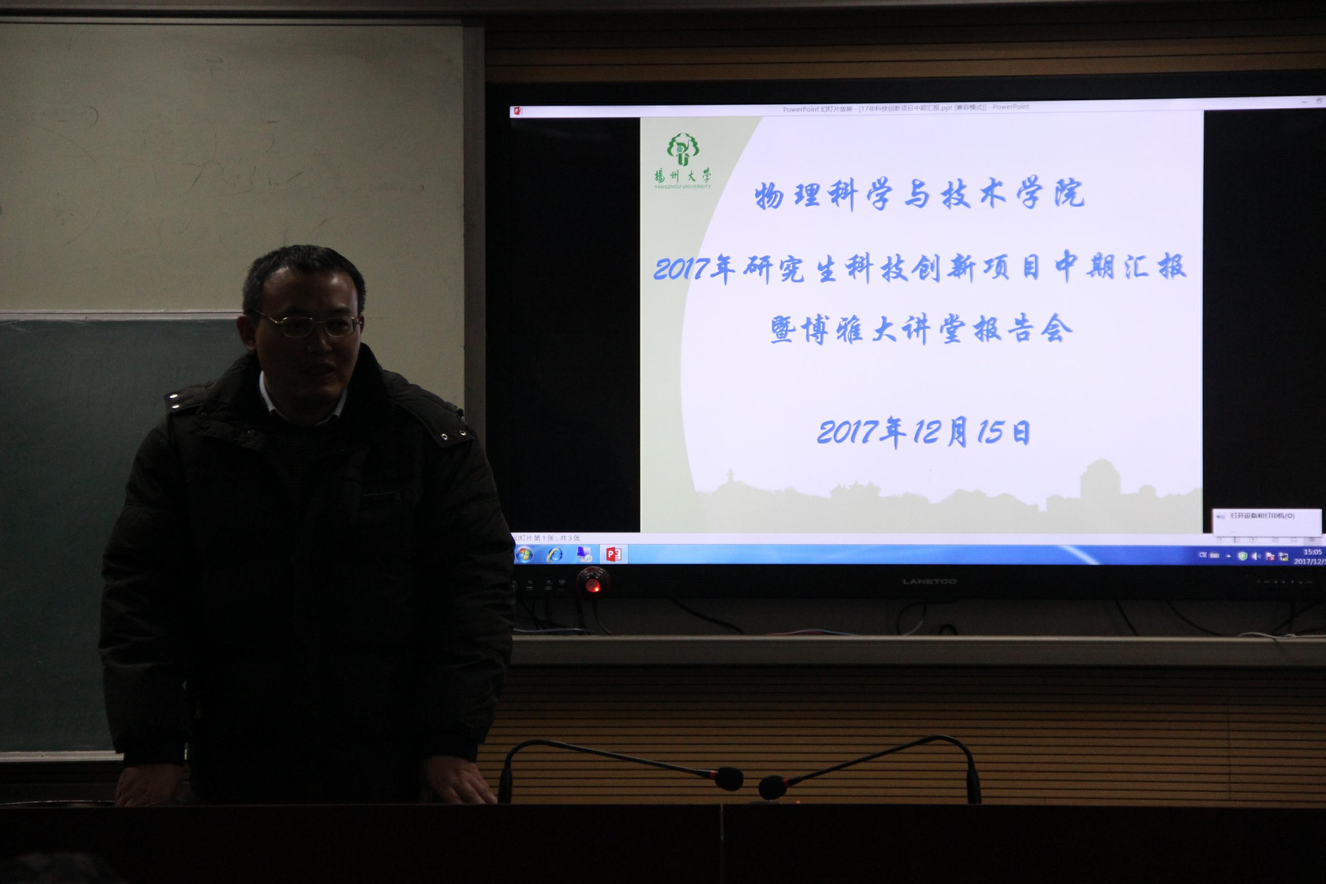 2017年物理科学与技术学院研究生科创项目中期汇报暨博雅大讲堂汇报交流会活动总结 12月15日下午3点,我院于物理楼310报告厅隆重举行2017年研究生科创项目中期汇报暨博雅大讲堂汇报交流会。此次活动旨在加强我院研究生之间的学术交流,构建良好的科研学术氛围,增强我院研究生的创新能力,通过先进模范的示范作用,构建“力争上游”、“奋进向前”的科研风气。本次活动由潘延双同学主持。出席本次活动的有分管学院科研工作的王健院长、科研秘书丁晓维老师、姜玉梅老师、夏炜炜老师、2016级研究生和2017级研究生。本次活动共分为三个环节.