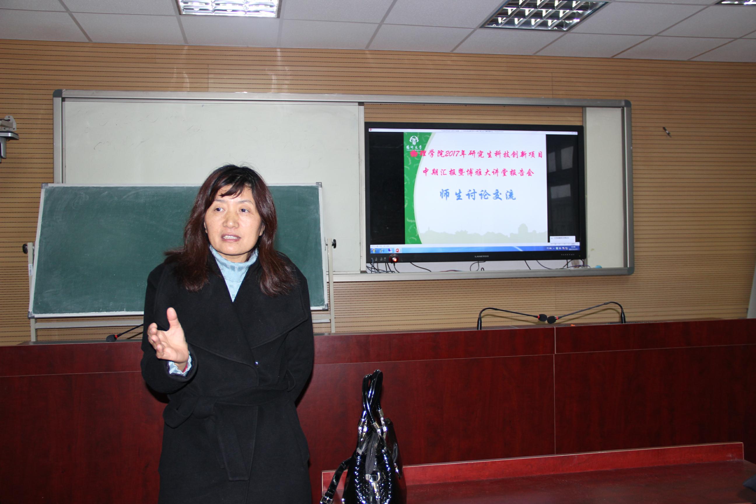 第三个环节是师生讨论交流环节,首先姜玉梅老师对三位同学的阐述进行了点评,然后姜老师通过分享自身多年积累的经验,提醒同学们进行学术汇报的时候应该要对自身课题有所取舍,要注意突出重点,同时个人表现状态要充满信心。然后,姜老师鼓励在场的研究生,要向进行汇报的同学学习,争取多拿项目。