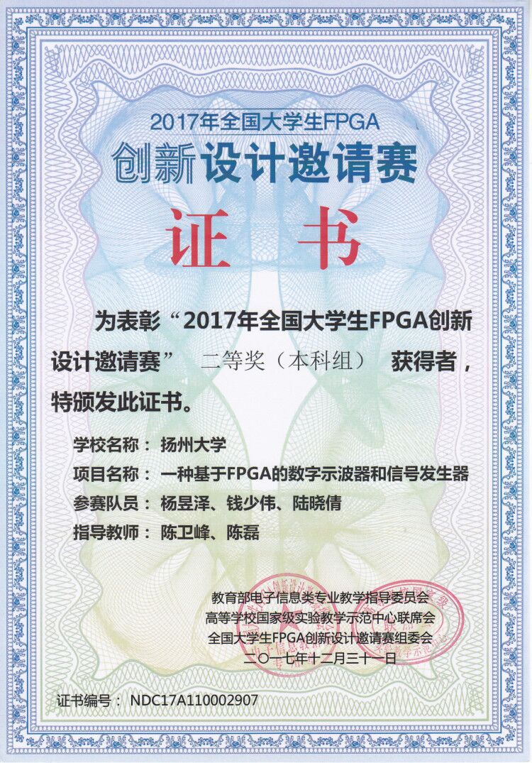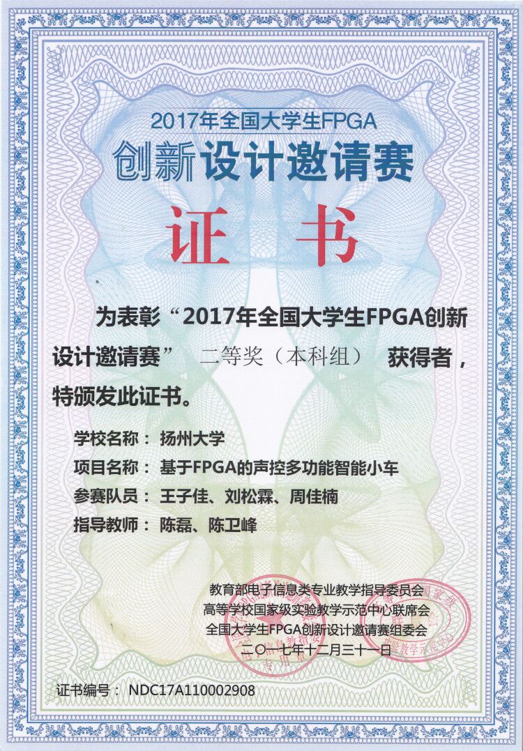 我院601实验室团队在“2017年全国大学生FPGA创新设计邀请赛”中获佳绩 12月31日,我院601实验室团队代表学院参加“2017年全国大学生FPGA创新设计邀请赛”。在我院陈磊老师与陈卫峰老师的带领与指导下,王子佳、刘松霖、周佳楠三位同学的“基于FPGA的声控多功能智能小车”项目及杨昱泽、钱少伟、陆晓倩三位同学的“一种基于FPGA的数字示波器和信号发生器”项目均获得二等奖的好成绩。