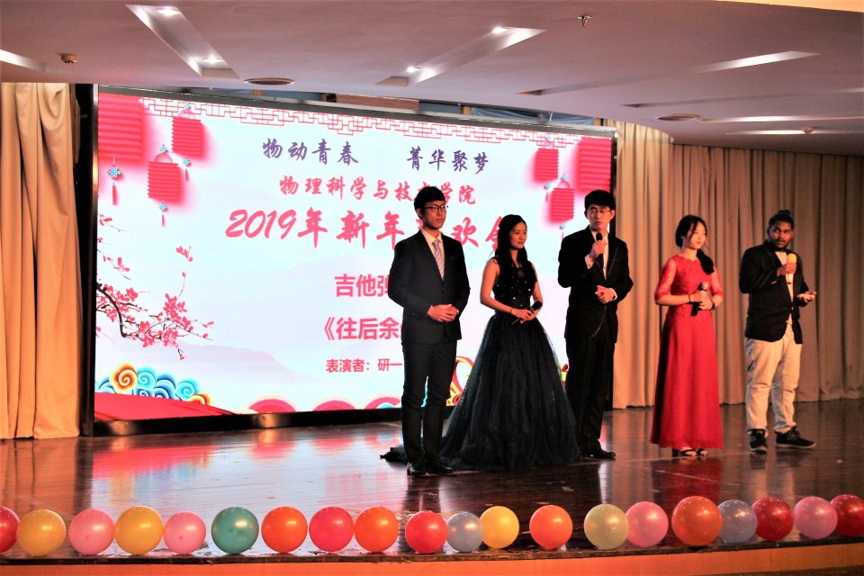 物动青春 菁华聚梦——物理科学与技术学院举办2019年师生新年联欢晚会 2018年已经接近尾声,为了迎接新一年的到来,物理科学与技术学院于2018年12月26日在扬州大学荷花池校区大学生活动中心二楼多功能厅举办师生联欢晚会。晚会邀请院党委书记王春雨老师、院长曾祥华老师、党委副书记周春开老师、副院长曹功林老师、副院长王伟老师、副院长王健老师参加,学院其他老师、研究生以及国际生共同参与此次晚会。