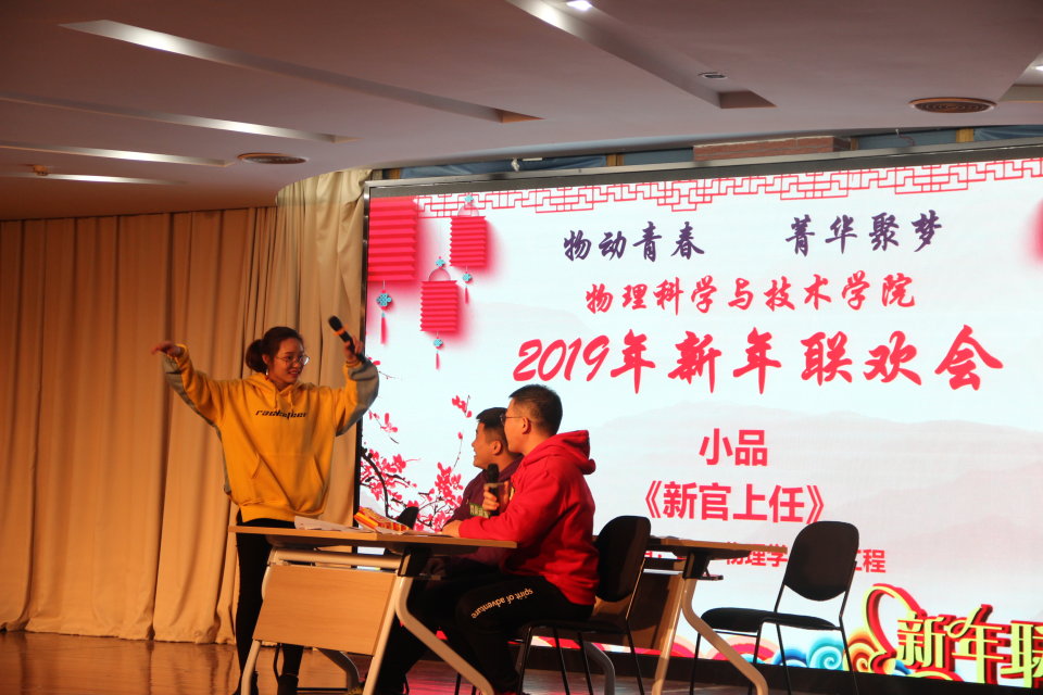 活动以院学生会同学激情的舞蹈开场,之后院由党委书记王春雨老师致辞。王书记带领同学们回顾了2018年物理学院取得的成就,并表达了对学院在明年能取得更好的成绩的期待。接下来就是节目表演环节了,节目共分为两板块,在第一板块中有旋律动人的吉他弹唱《往后余生》、热情的外语歌曲《English song duo》、悦耳的小提琴演奏《天路》。第二个板块的节目更加丰富多彩,有令人开怀大笑的小品《新官上任》、有好听的外语歌曲《Chinese song》和《project bangla》。节目中间和晚会最后更是穿插着有趣的抽奖环节和游戏互动环节,最后在学科教学研究生的诗朗诵《青春万岁》中圆满地结束了此次晚会。
