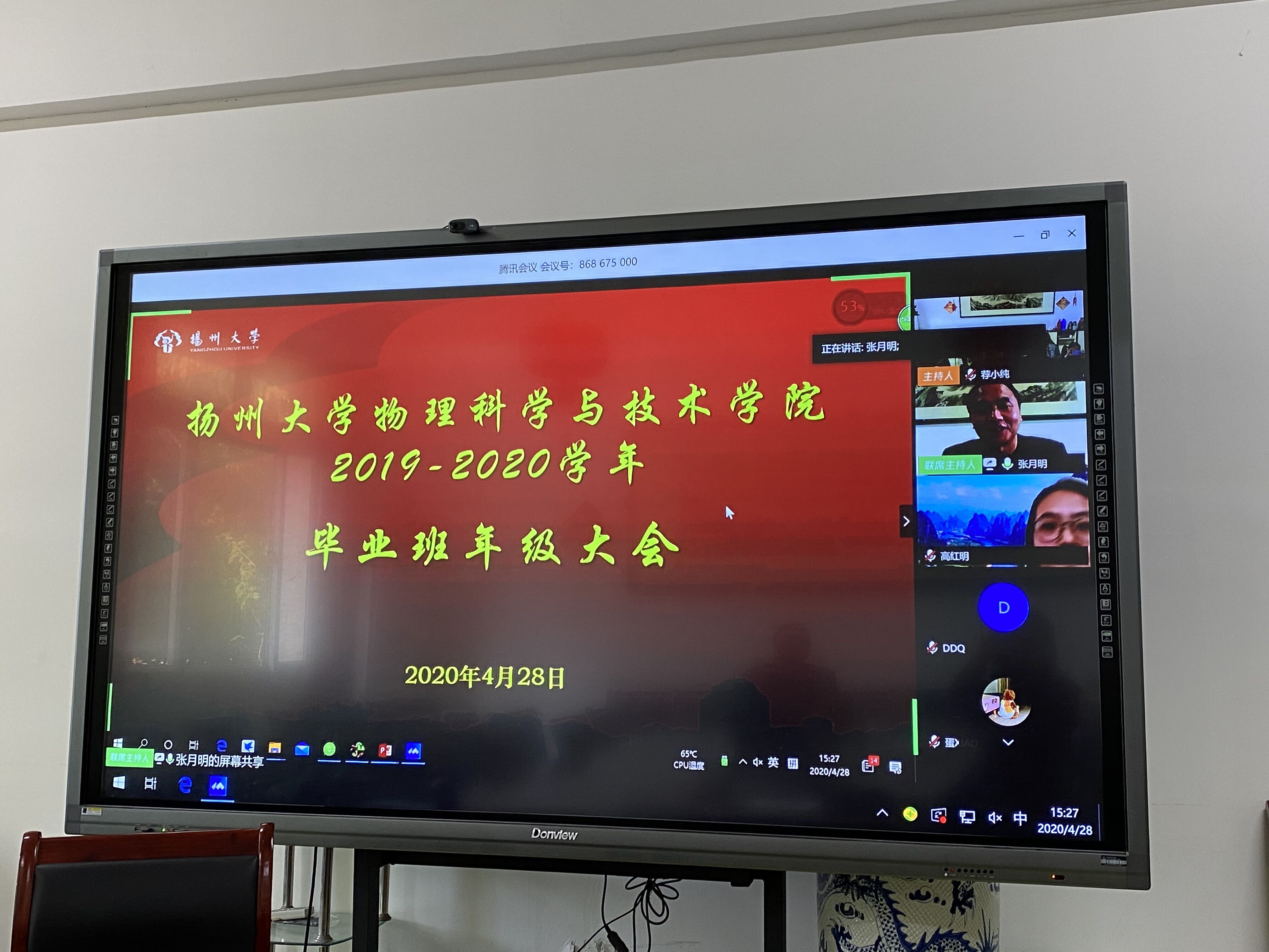 物理科学与技术学院召开2019-2020学年本科生毕业班年级大会4月28日下午,物理科学与技术学院通过“腾讯会议”于线上召开了2019-2020学年本科生毕业班年级大会。大会旨在帮助我院本科毕业生认识到就业现状,顺利毕业、尽早就业。院党委副书记高红明出席本次会议,会议由团委副书记张月明主持。