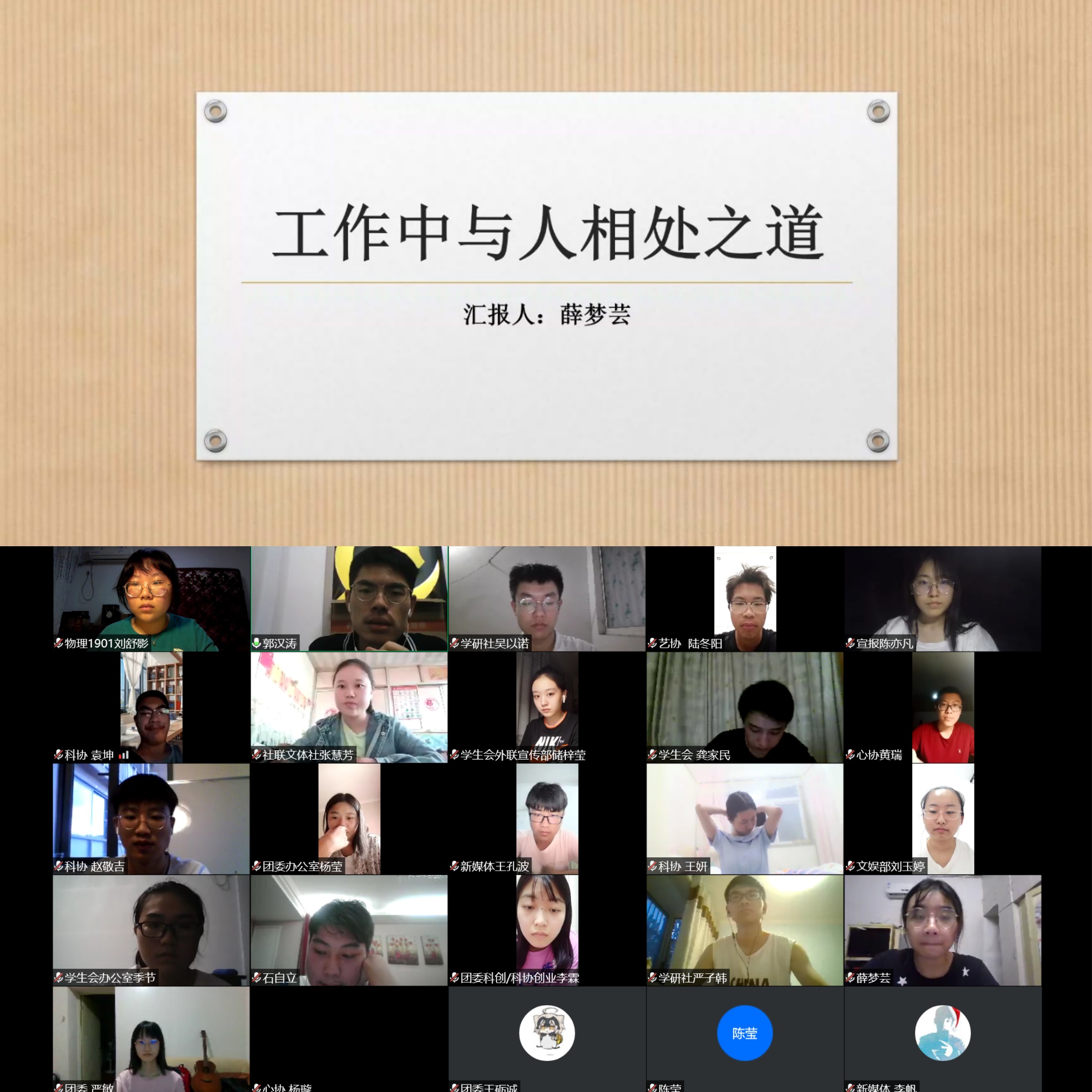 8月18日晚,物理科学与技术学院“2020年学生干部培训班”第三讲邀请到了曾任科学技术协会副主席薛梦芸学姐为学生干部开展“工作中与人相处之道”的线上讲座。