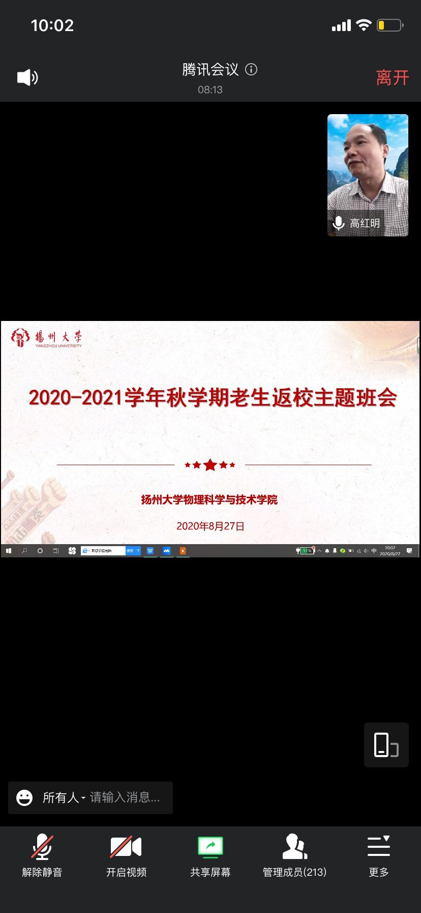8月27日,物理学院党委副书记高红明为全体返校老生召开秋学期返校主题班会,细致讲解了返校相关安排、注意事项,叮嘱学生加强防护、增强体质,好好复习,准备开学之后的考试。