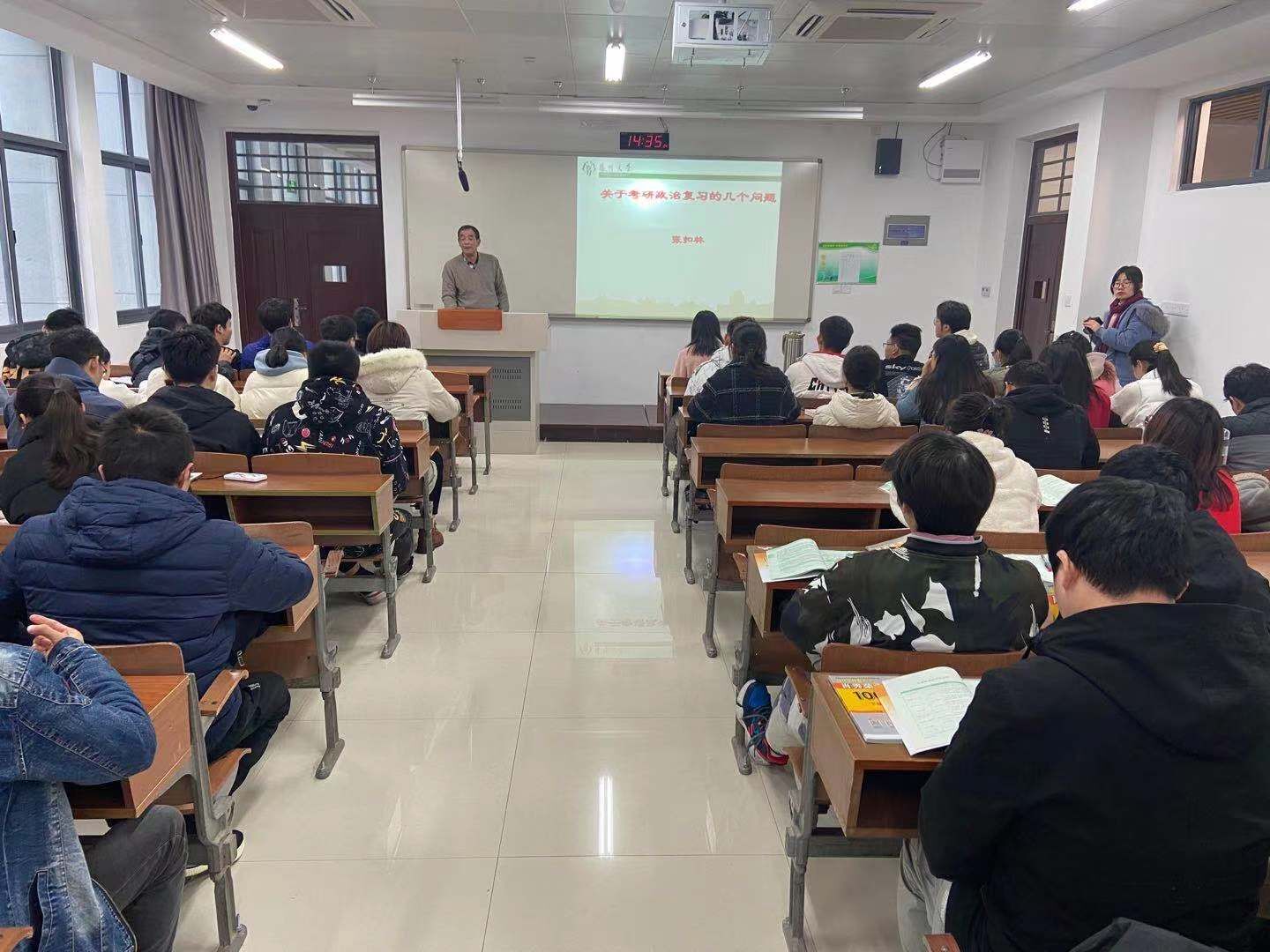 物理学院邀请张扣林教授为2021届考研学子做政治辅导 11月25日下午,我院邀请马克思主义学院张扣林教授为2021届考研学子做政治辅导。自两点半开始的两个多小时,这间小小的教室里却装载了那么多人的梦与未来。考研学子们和我院的辅导员老师们聚在这里,一切都是为了扬大学子的考研梦可以如他们所愿罢了。