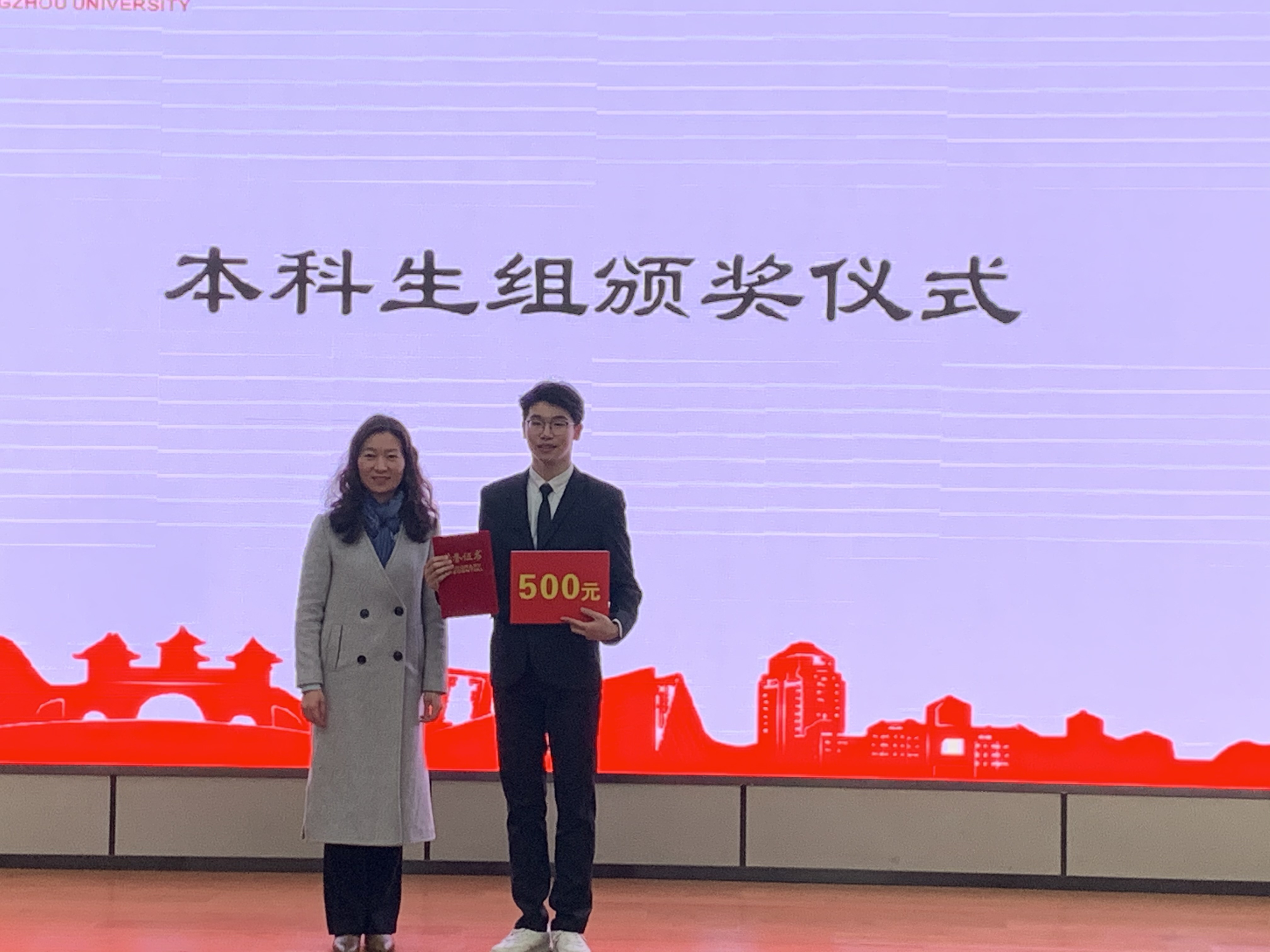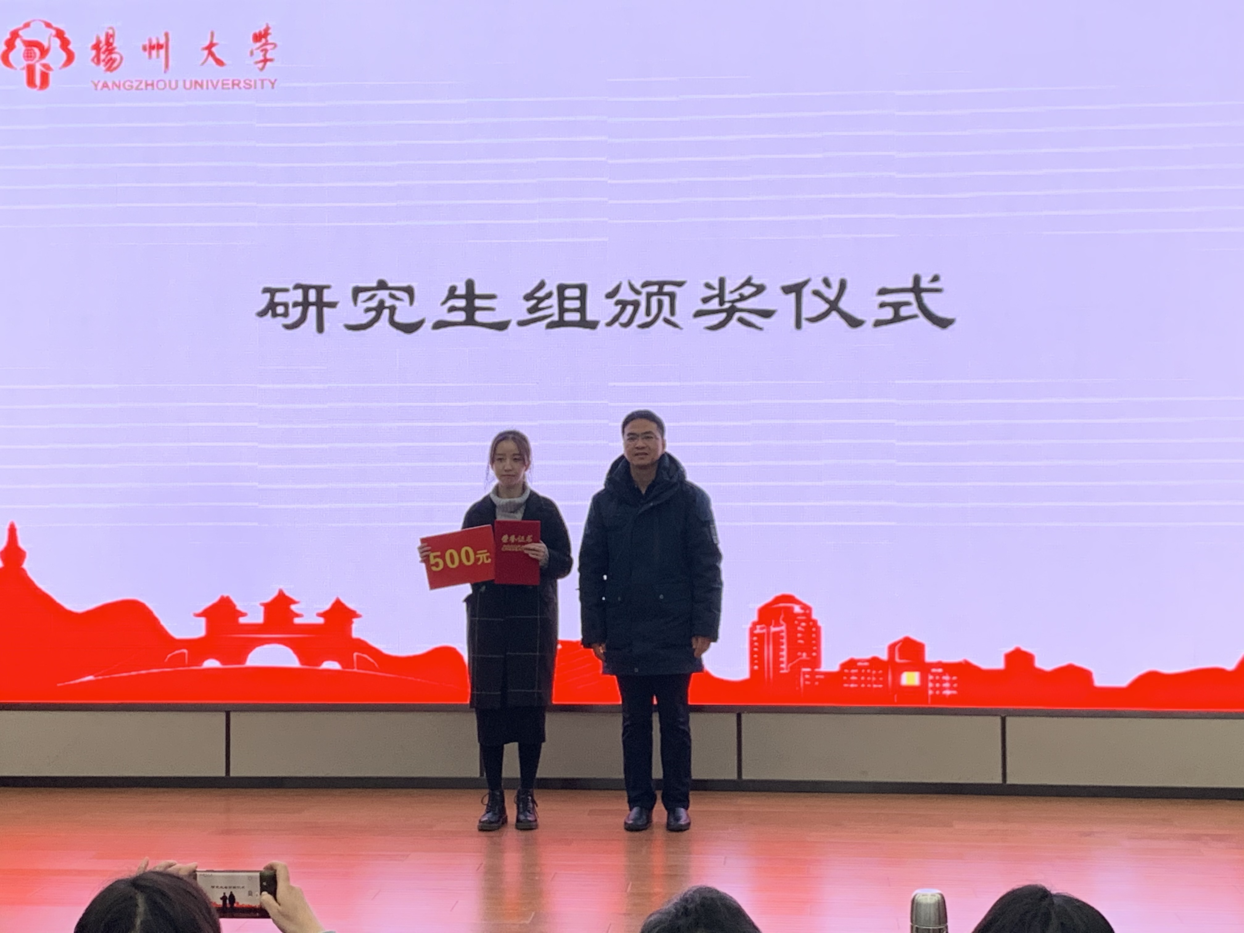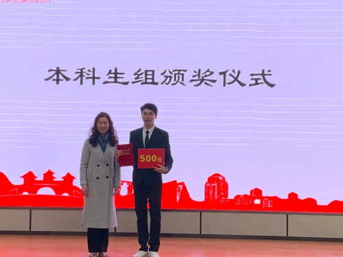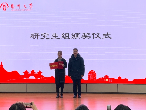 晚上,大赛举行闭幕式暨颁奖典礼,典礼邀请了扬州大学学生工作部(处)副部(处)长、心理健康教育中心主任侯燕老师,扬州大学研究生工作部副部长姚丰华老师。扬州中学金年庆老师和邗江中学高正球老师分别对本科生组和研究生组进行点评和总结。侯燕处长、姚丰华部长等与会嘉宾为获奖学生颁发证书与奖金。最后领导嘉宾与参赛选手合影留念,大赛完满结束。