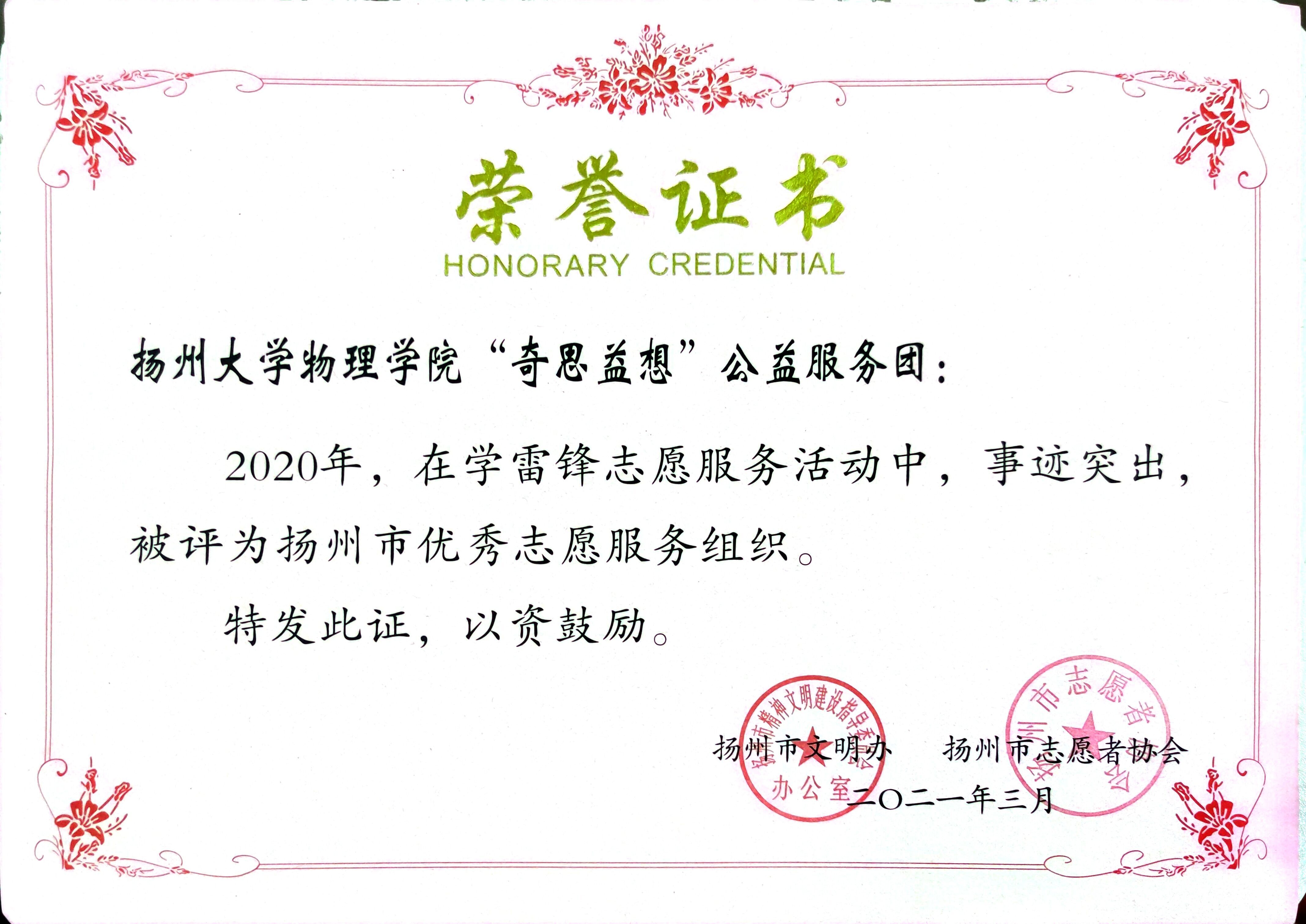 喜讯:我院“奇思益想”公益服务团荣获2020年度扬州市优秀志愿服务组织