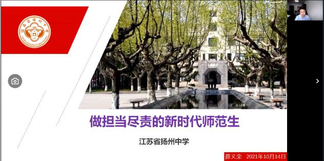 2021年10月14日,扬州大学物理学院邀请1996届毕业生苏州大学、扬州大学兼职硕士生导师薛义荣教授为大一新生开展做“担当尽责的新时代师范生”线上专题讲座。薛教授分别从争做新时代的师范生,为明天教书育人担当,为培育时代新人尽责三个方面讲述了如何做好一位教师。